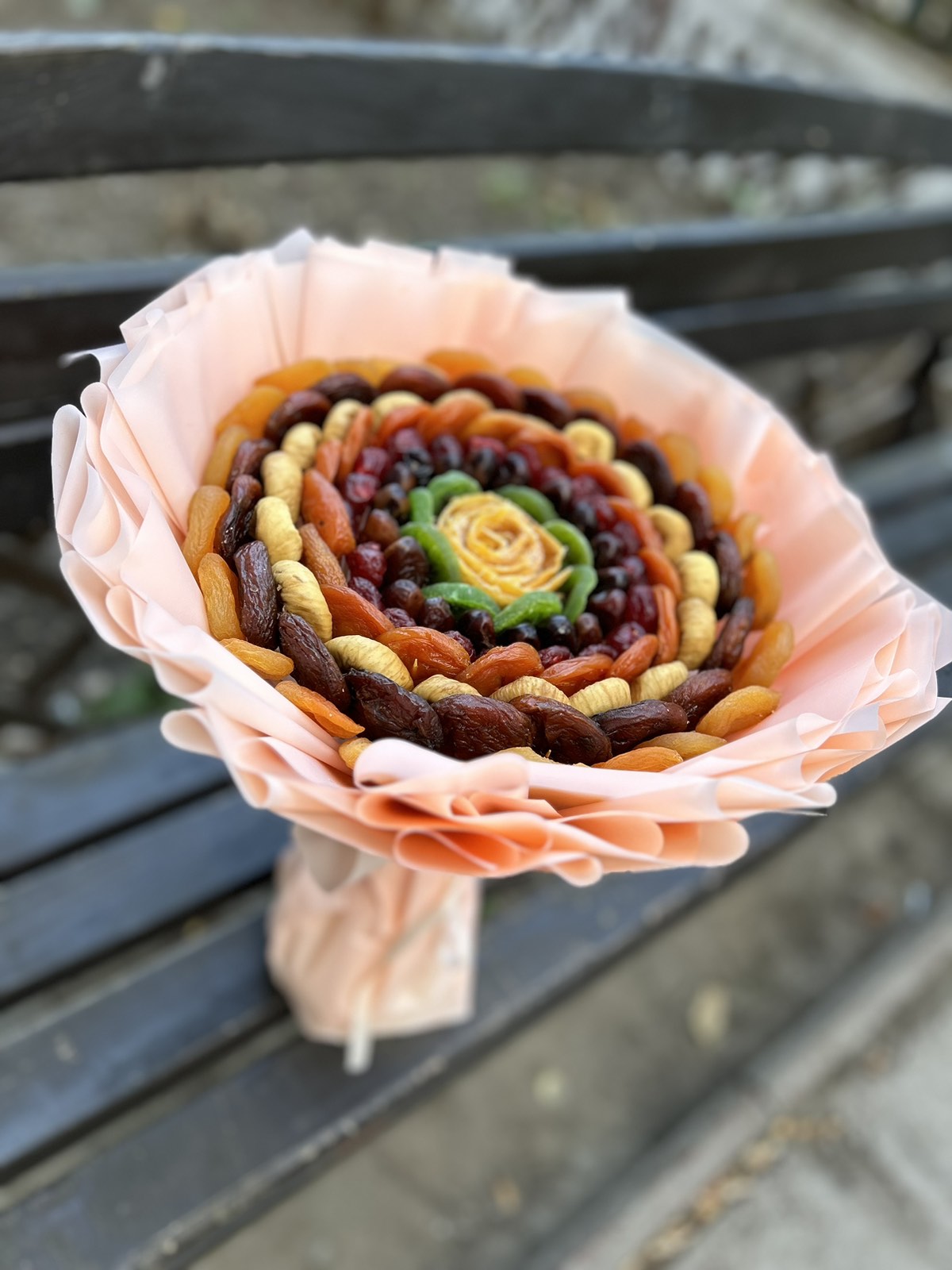 Букет из сухофруктов, подобный тому, что на нашем фото.