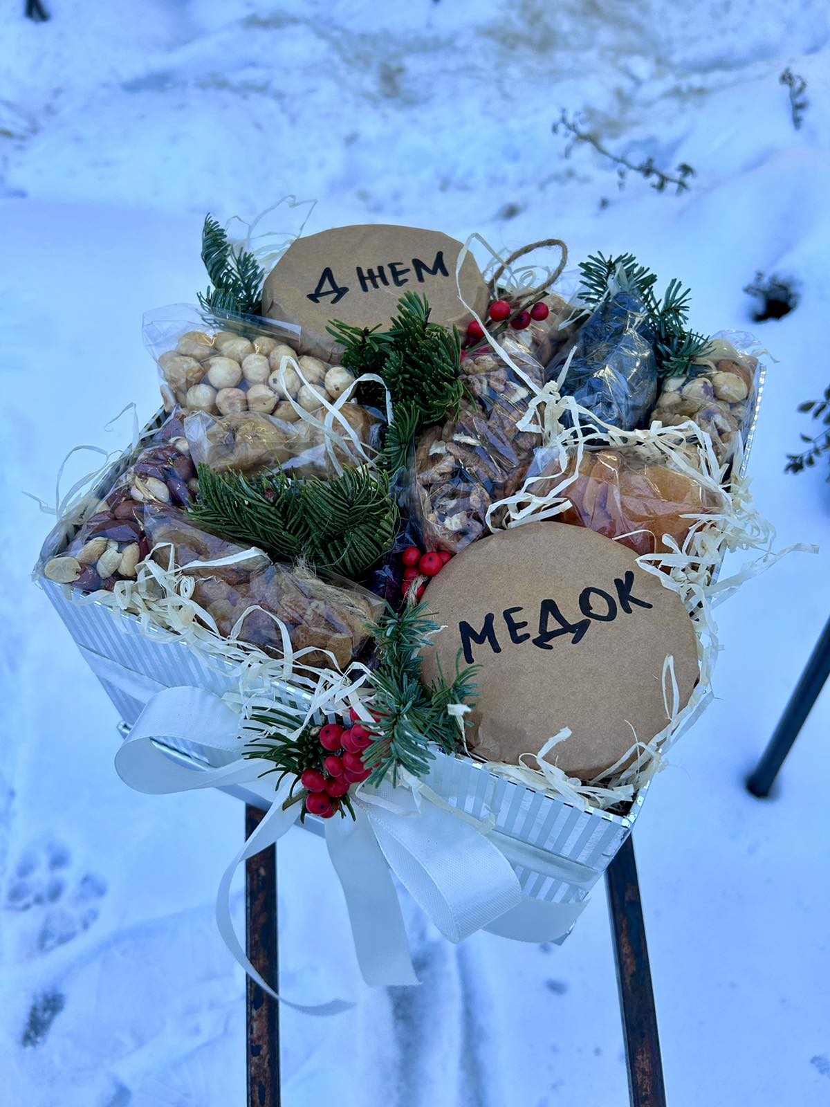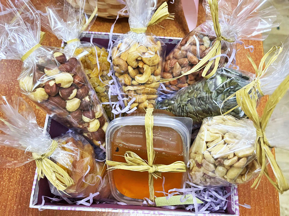 Мы предлагаем 2 размера микса №1 из сухофруктов, орешков с баночкой натурального меда. Все ингредиенты будут упакованы в подарочную коробку. Ее форма и цвет могут отличаться от представленных на нашем фото и зависят от выбора коробок в нашем цветочном магазине на данный момент.