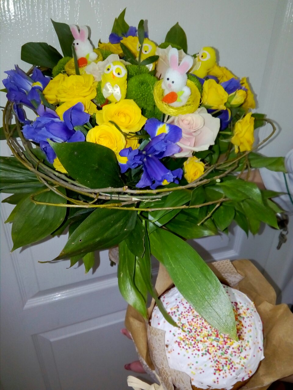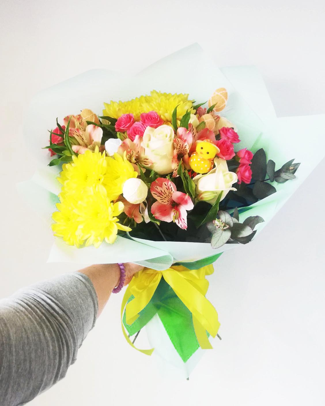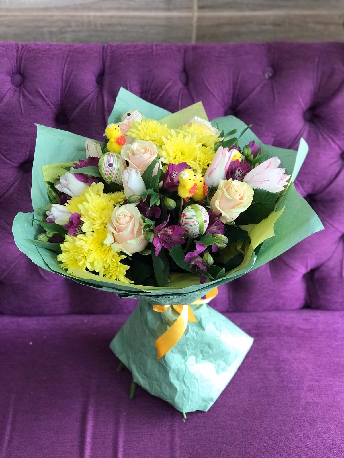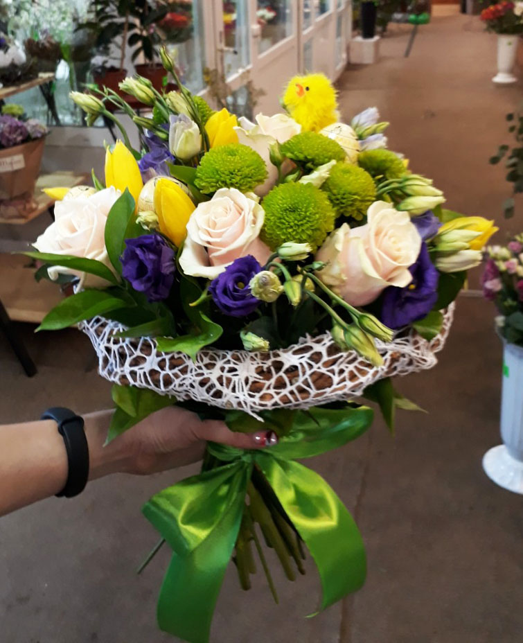 Традиционно Пасхальные букеты создаются, конечно же из таких долгожданных, нежных и ароматных весенних цветов! Преобладающий цвет - желтый! Понятно, почему? Нет? Ну, как же! Один из символов и активных "участников" пасхальных празднеств является яйцо. А также - декоративный новорожденный желтенький цыпленок. И декоративные яйца, и фигурки цыплят, с удовольствием используются флористами при составлении Пасхальных букетов.