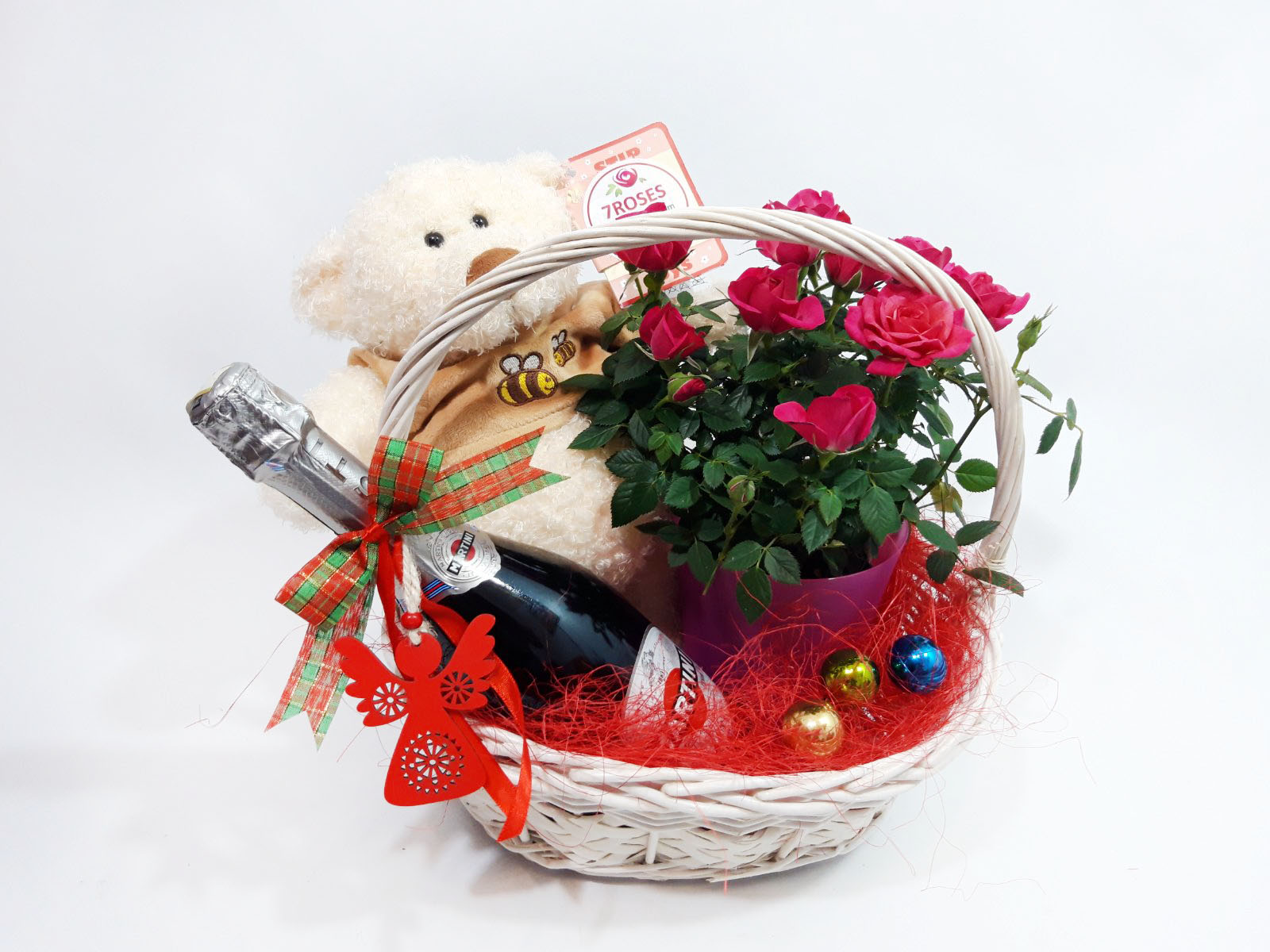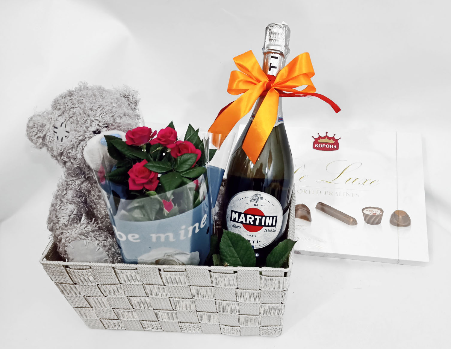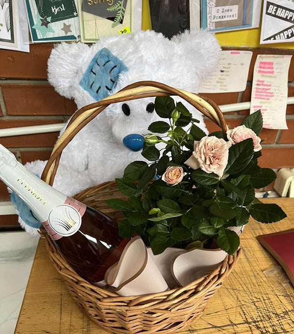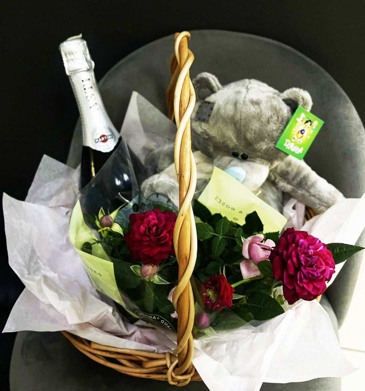 Все это красиво выкладывается в плетеной корзинке, которую оригинально и празднично украсят наши флористы.