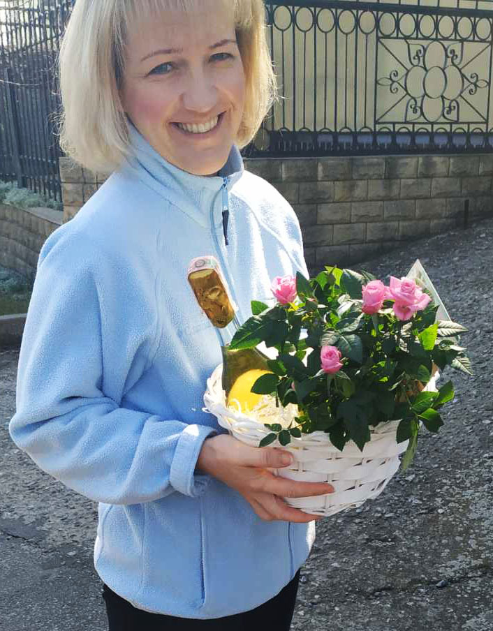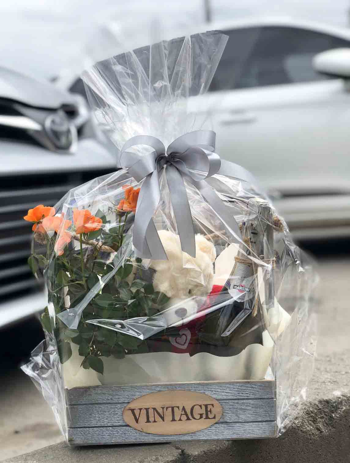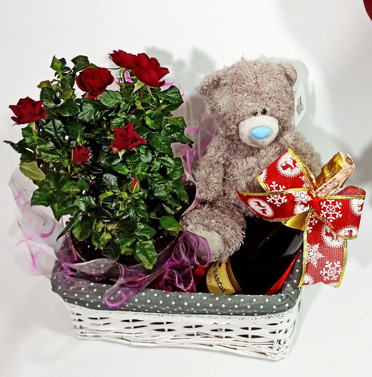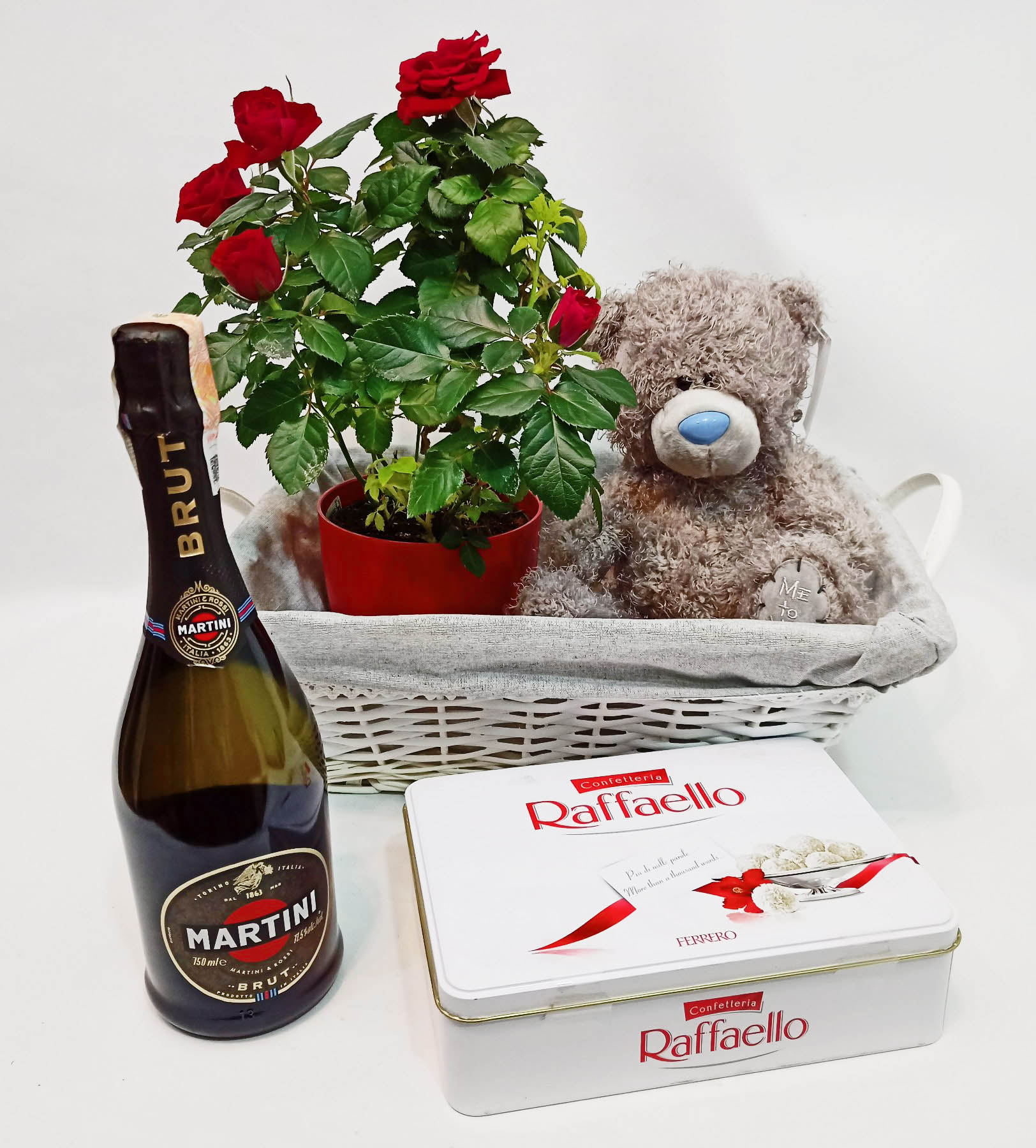 Все это красиво выкладывается в плетеной корзинке, которую оригинально и празднично украсят наши флористы.