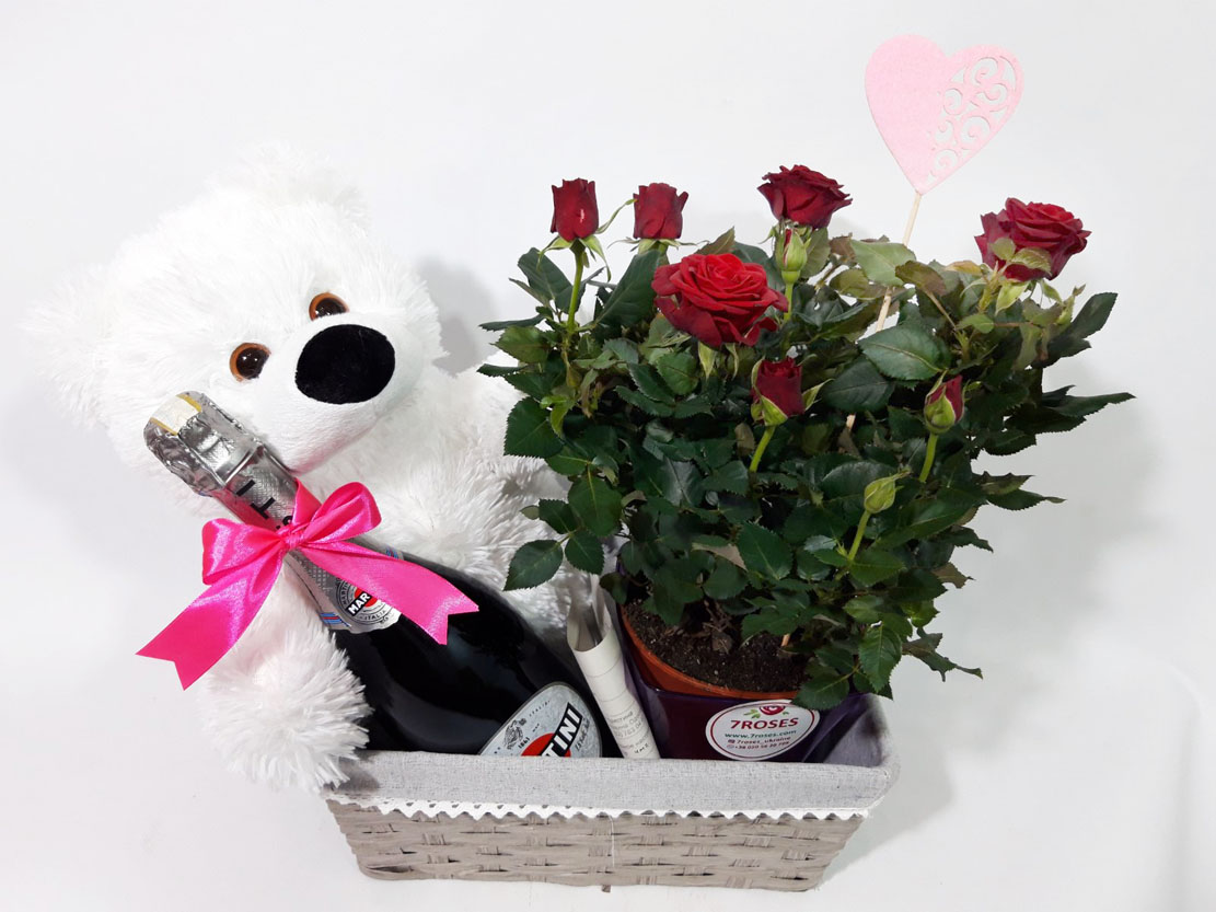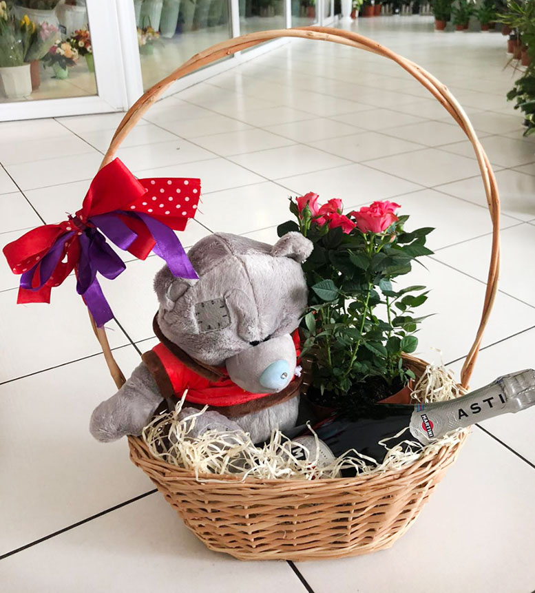 Что еще нужно для того, чтобы ощутить настоящий праздник? Нежные цветы (растение в горшке) для души, милый, славный, теплый и мягкий мишка и... немного отличного итальянского или французского шампанского игристого вина (0,75 л) для удовольствия и настроения!