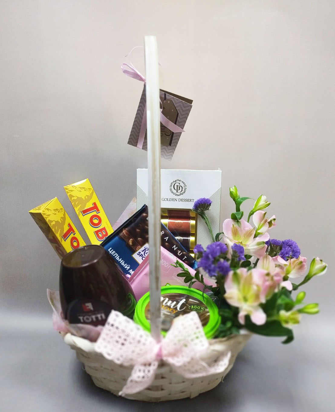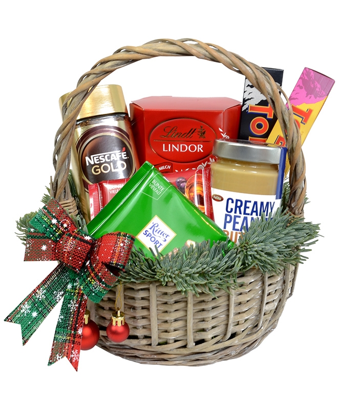 Корзинка будет обязательно празднично оформлена, внутри с комфортом разместятся коробка импортных шоколадных конфет, две шоколадки Тоblerone, две шоколадки Ritter Sport, баночка арахисовой пасты и конечно же баночка растворимого кофе.