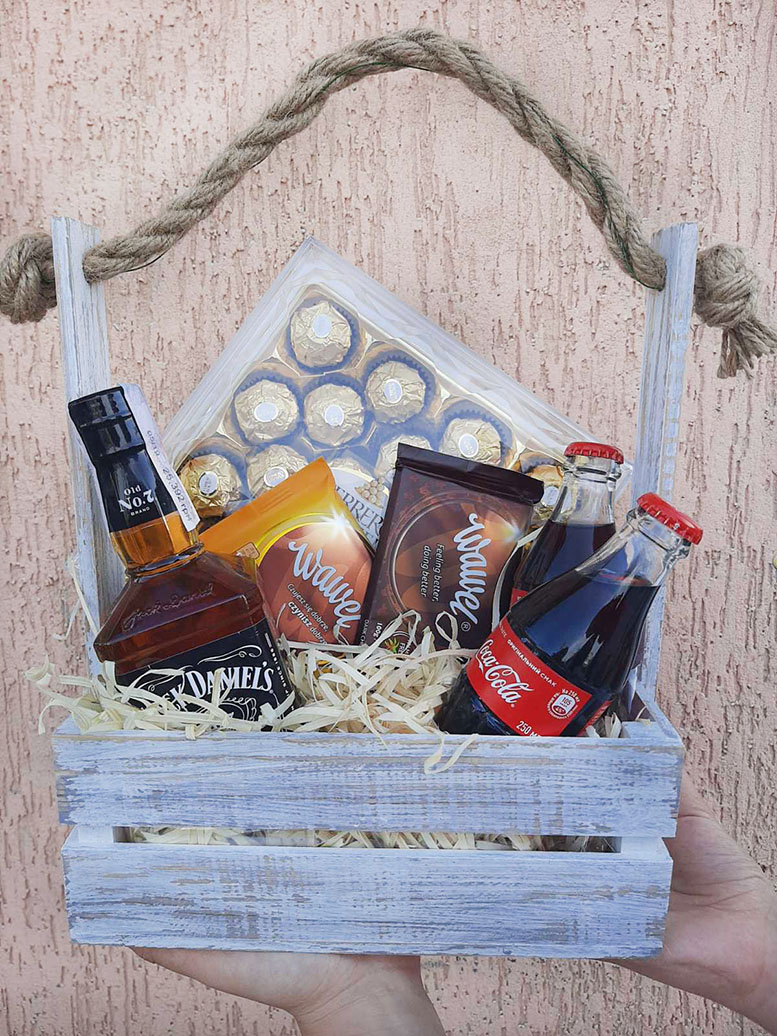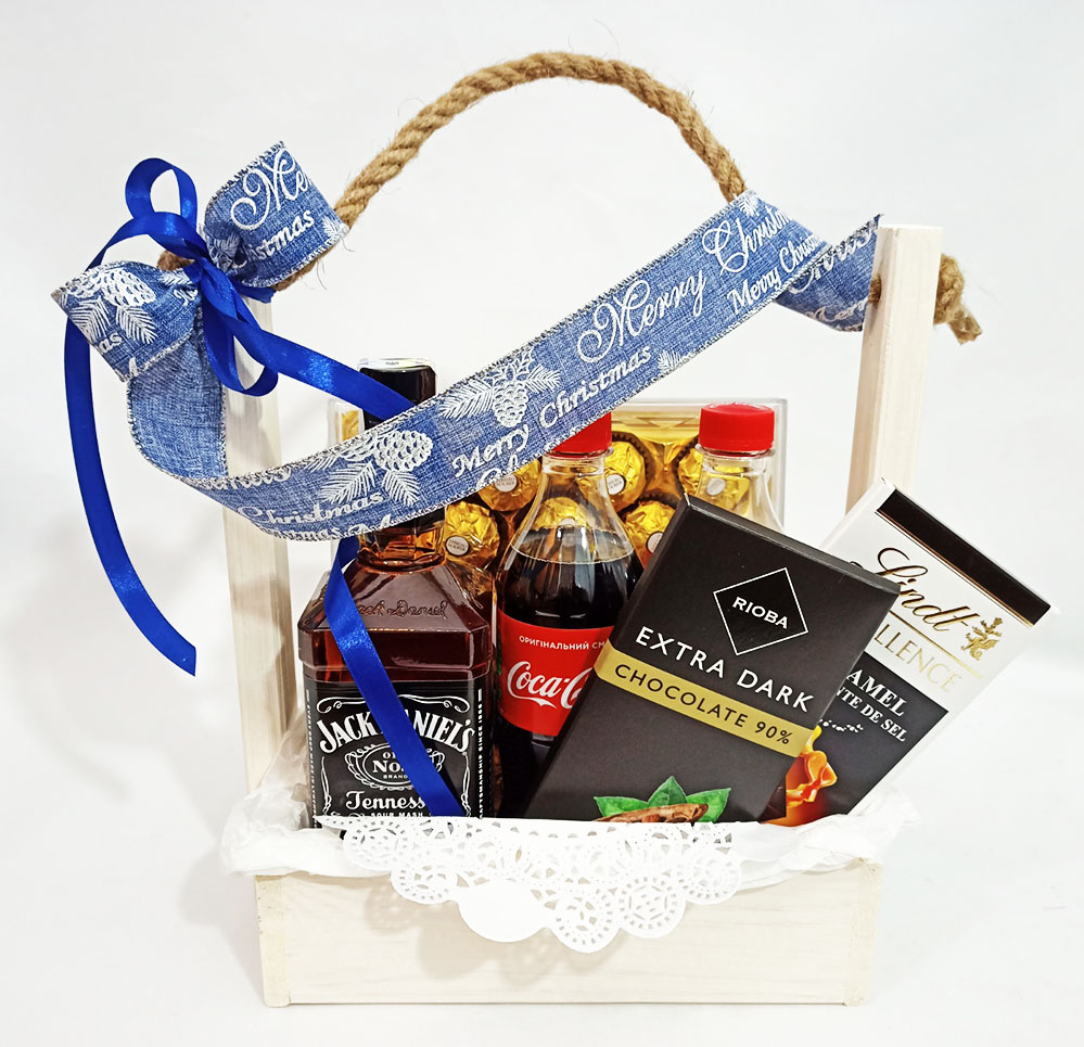 1 x Джек Дениелс 0,5л 2 x бут. Кока-Колы, 0,25л 2 x импортные шоколадки, 100 гр 1 х коробка Ферреро Роше 260-300 гр. Корзинка, декор
