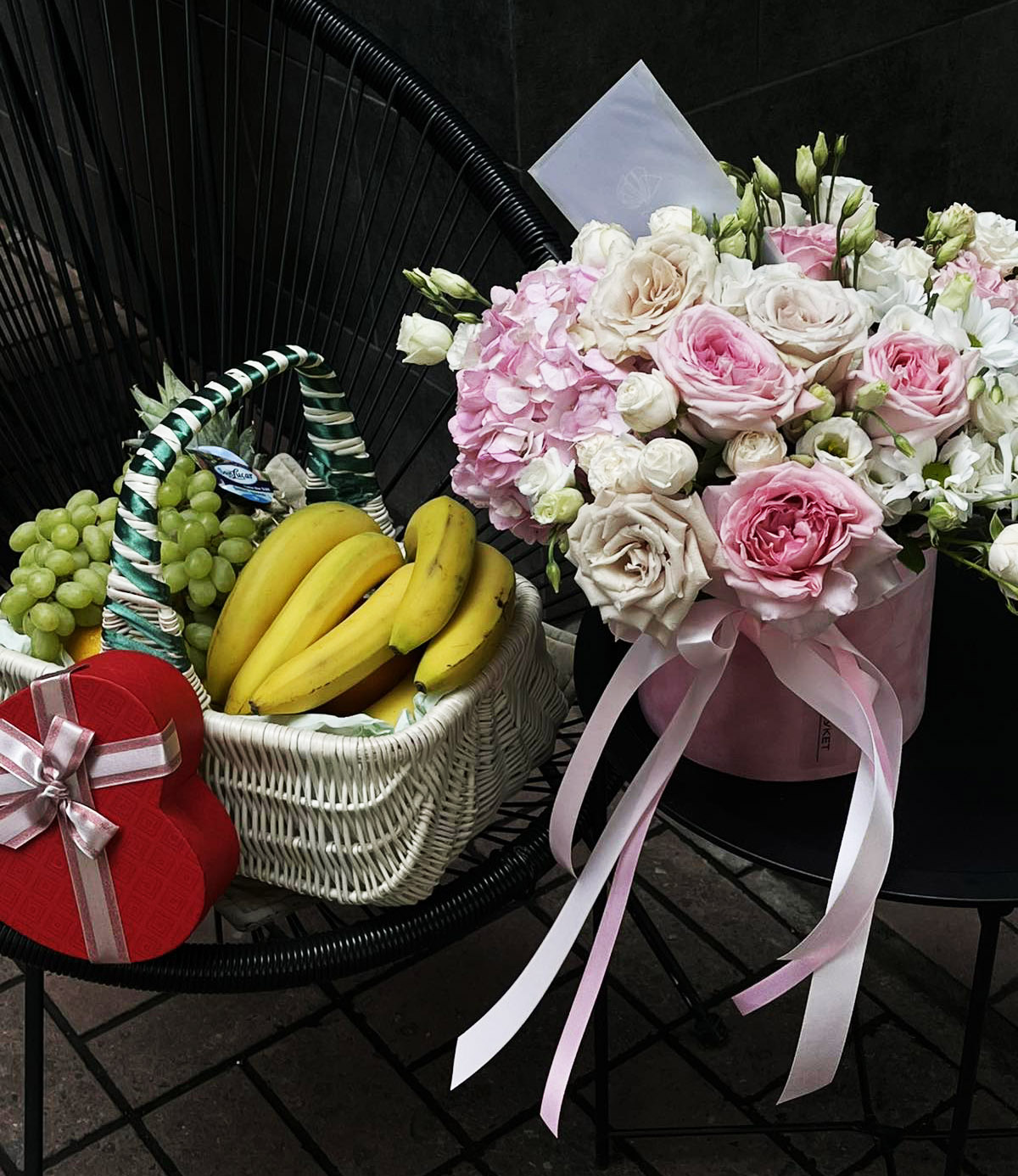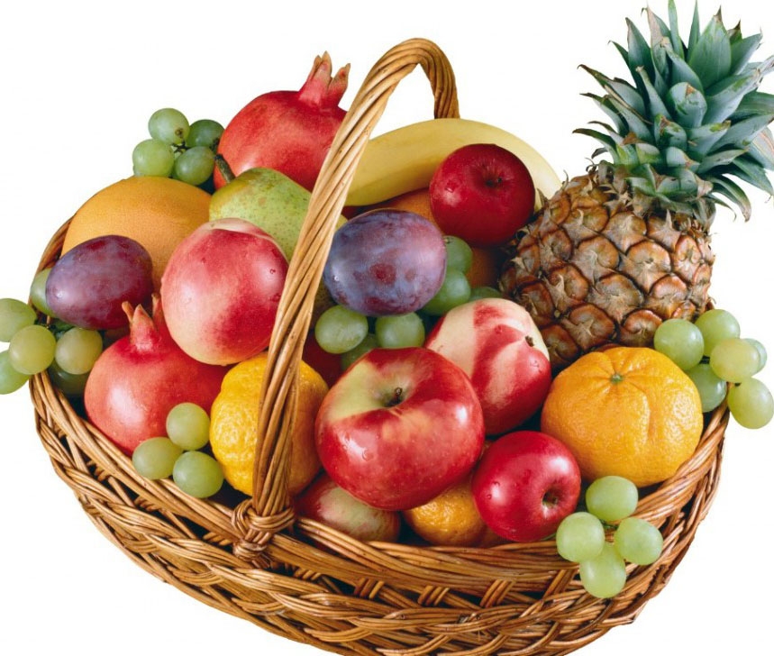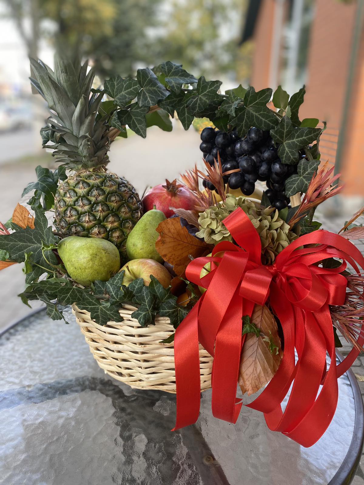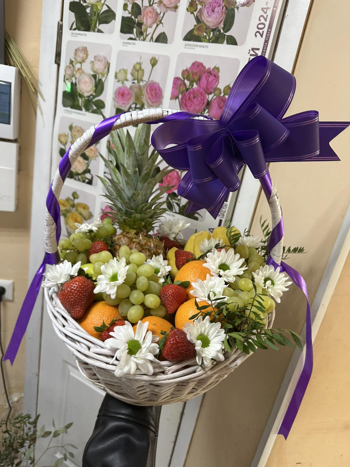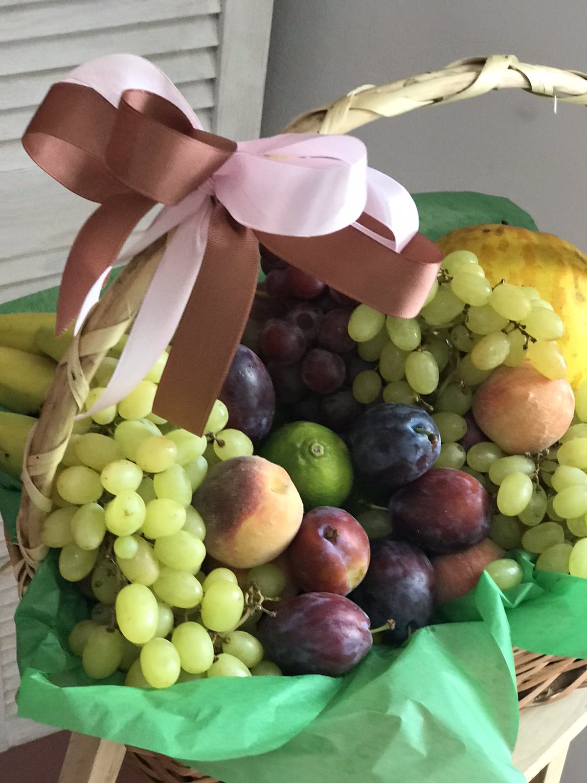 Мы выберем самые красивые и свежие фрукты в наших магазинах: ананас, яблоки, груши, виноград, лимоны, апельсины, киви. Если в наличии будут сезонные фрукты - сливы, персики, или гранат и т.д. - тоже обязательно вложим.