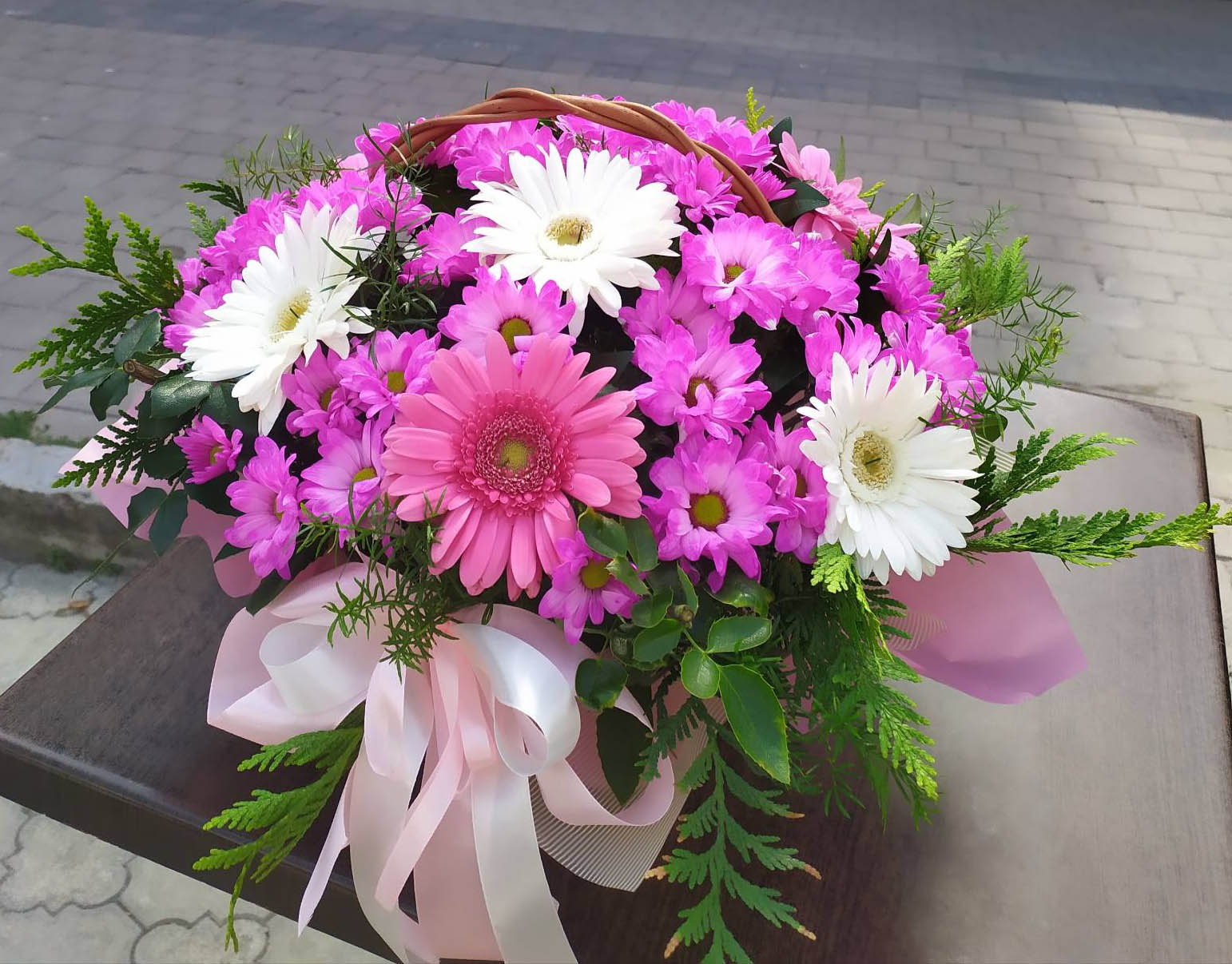 Цветочная корзина с белыми и розовыми герберами способна растопить самое холодное сердце, и заставить получателя улыбнуться даже в серый, дождливый день.