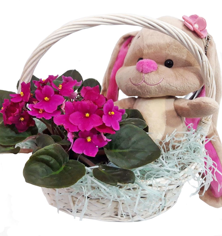 Такой очаровательный подарок в корзинке: цветущее растение в горшочке и маленькая игрушка - зайчик, или другая, в зависимости от выбора в наших магазинах. Мы выберем самую очаровательную.
