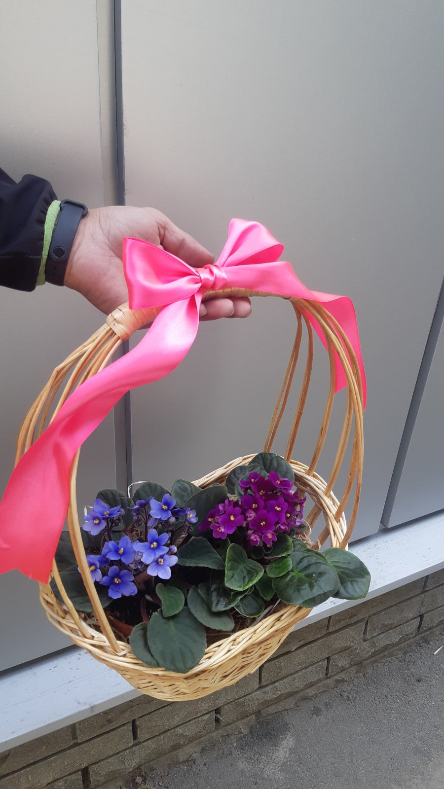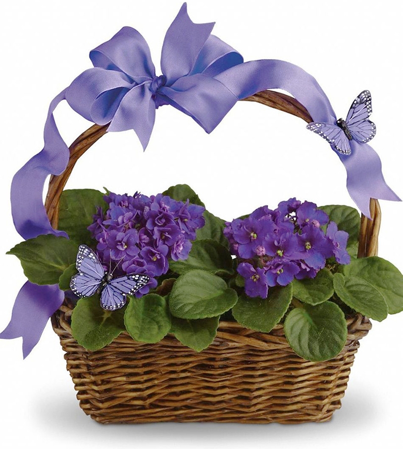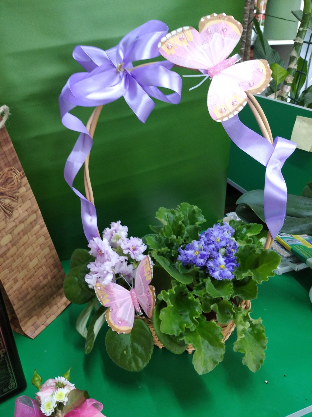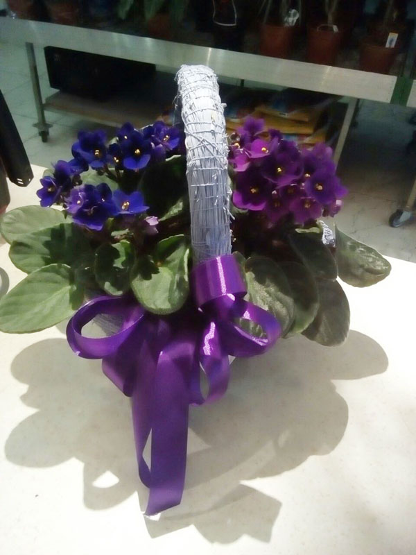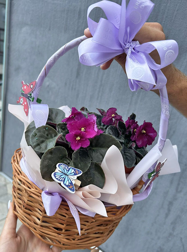 В этой подарочной корзинке, мило оформленной, 2 вазончика с фиолетовыми цветами.