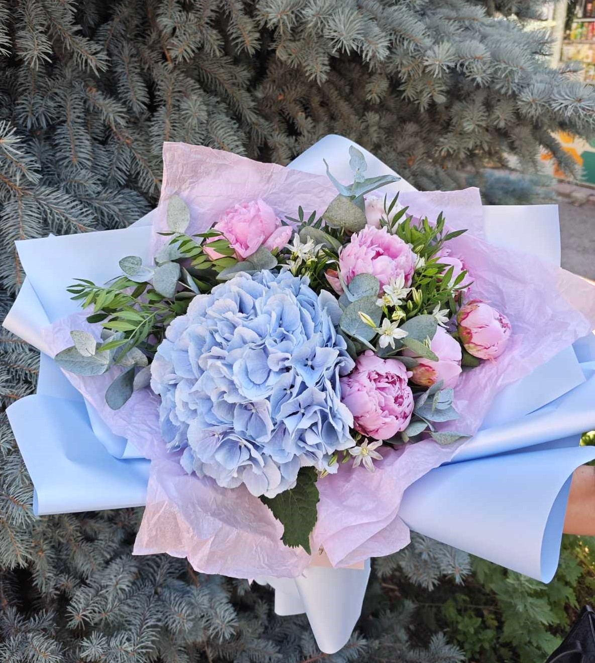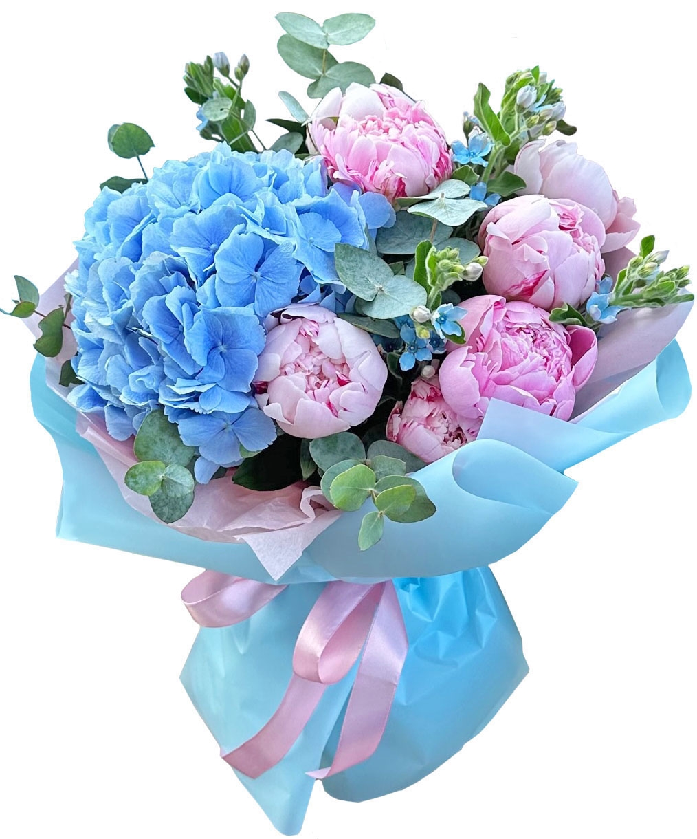 Крупные и пышные цветы розовых пионов на фоне светло-голубой или синей гортензии выглядят действительно впечатляюще!