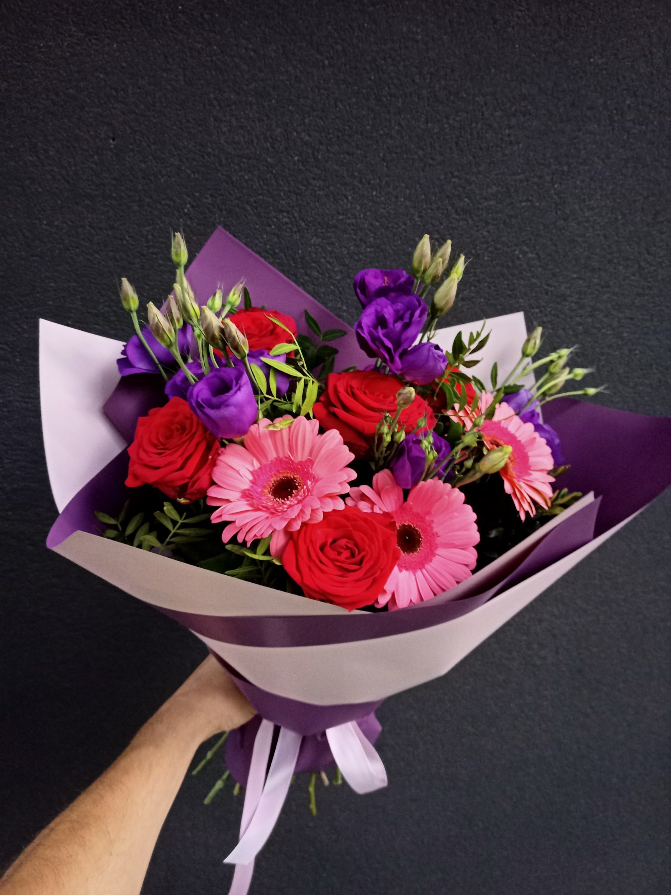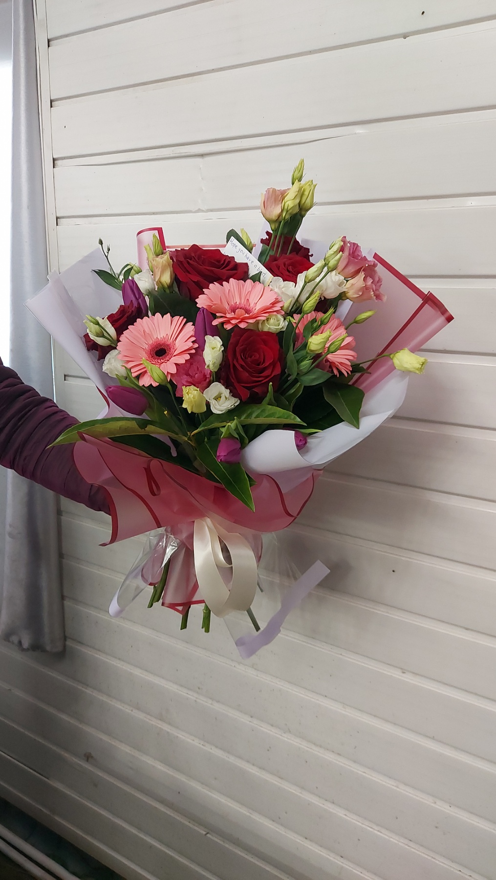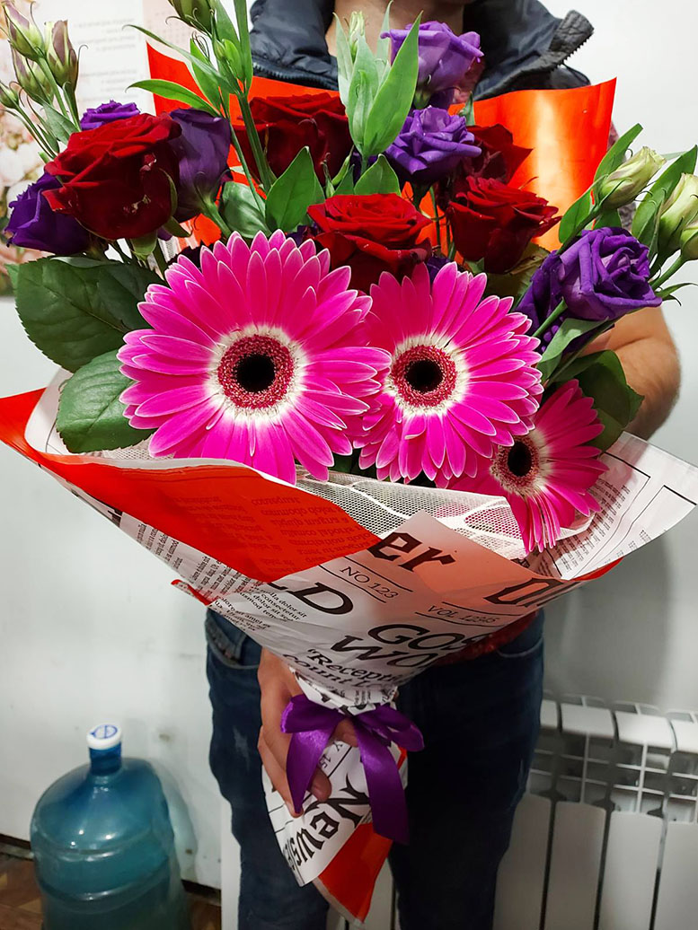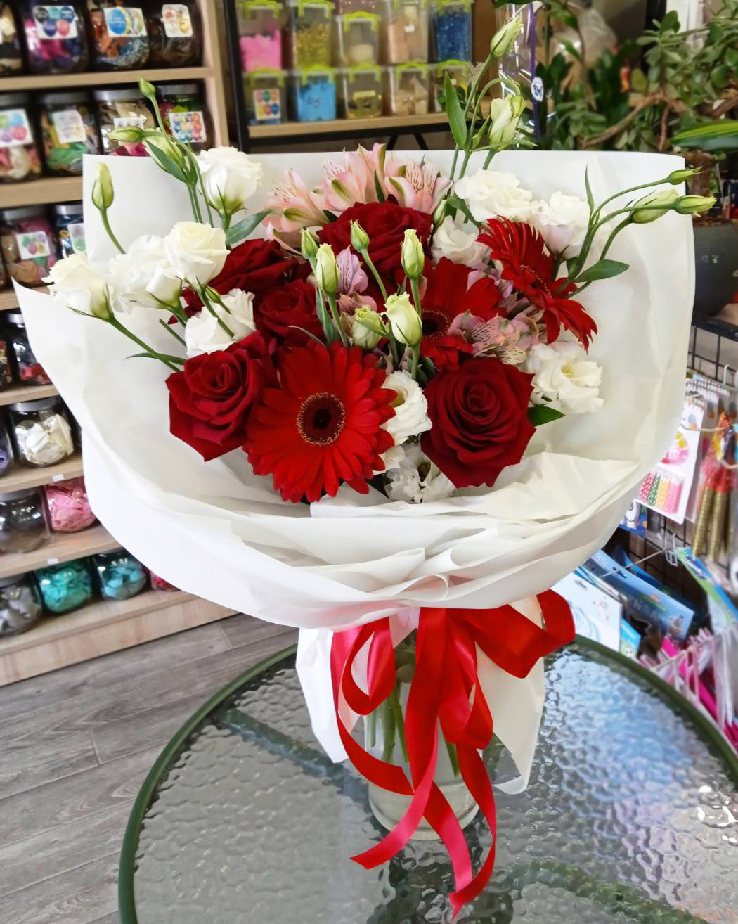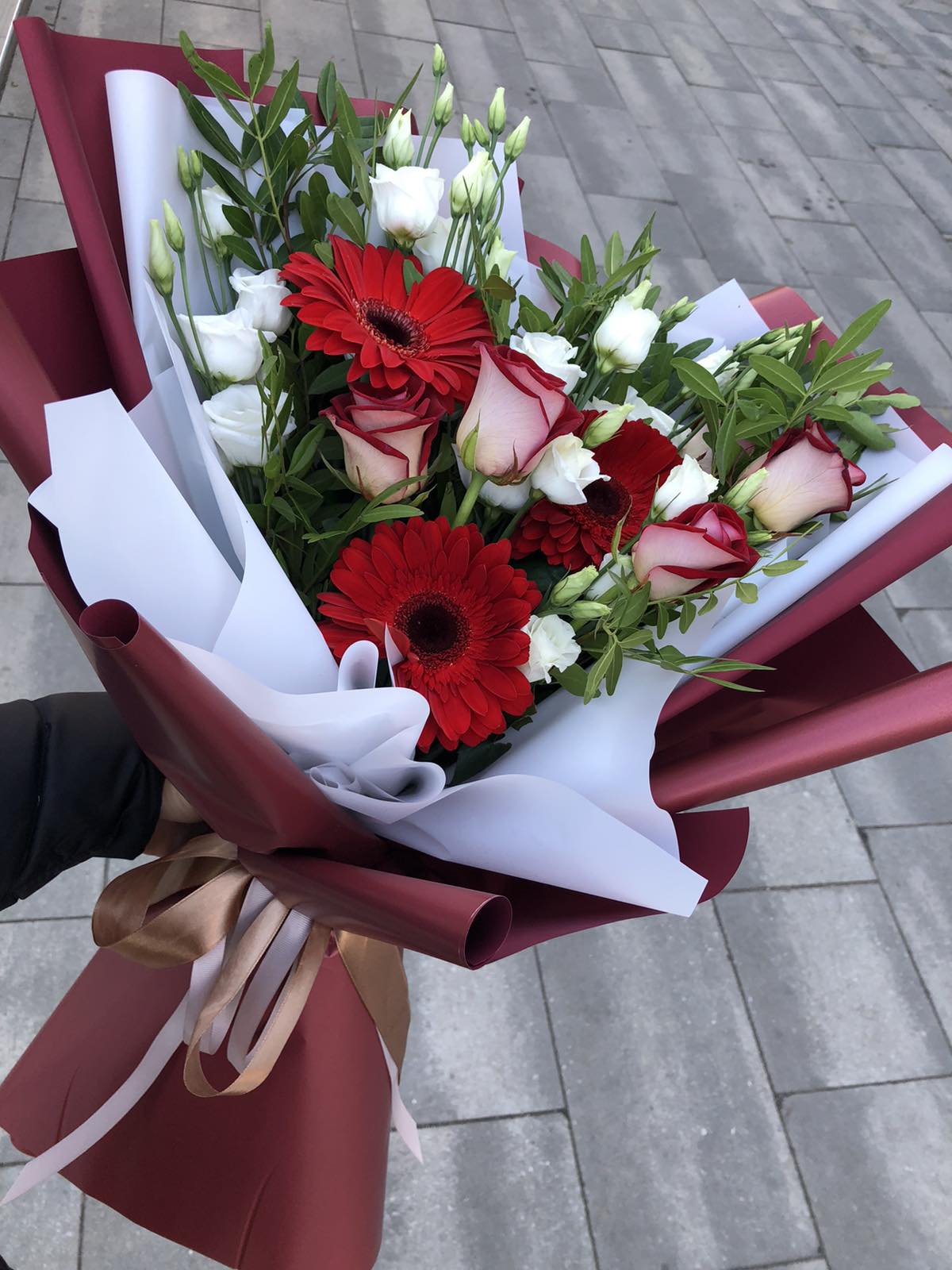 3 x Красные розы 3 x Белые розы 3 x Герберы 3 x Эустомы 3 x Альстромерии