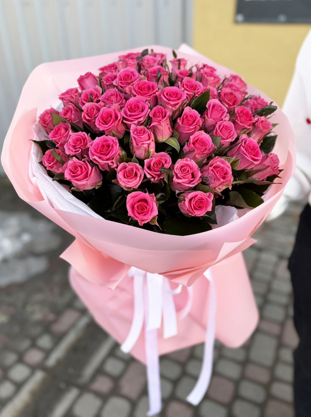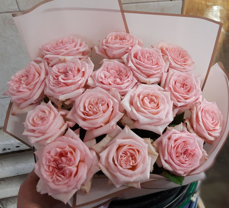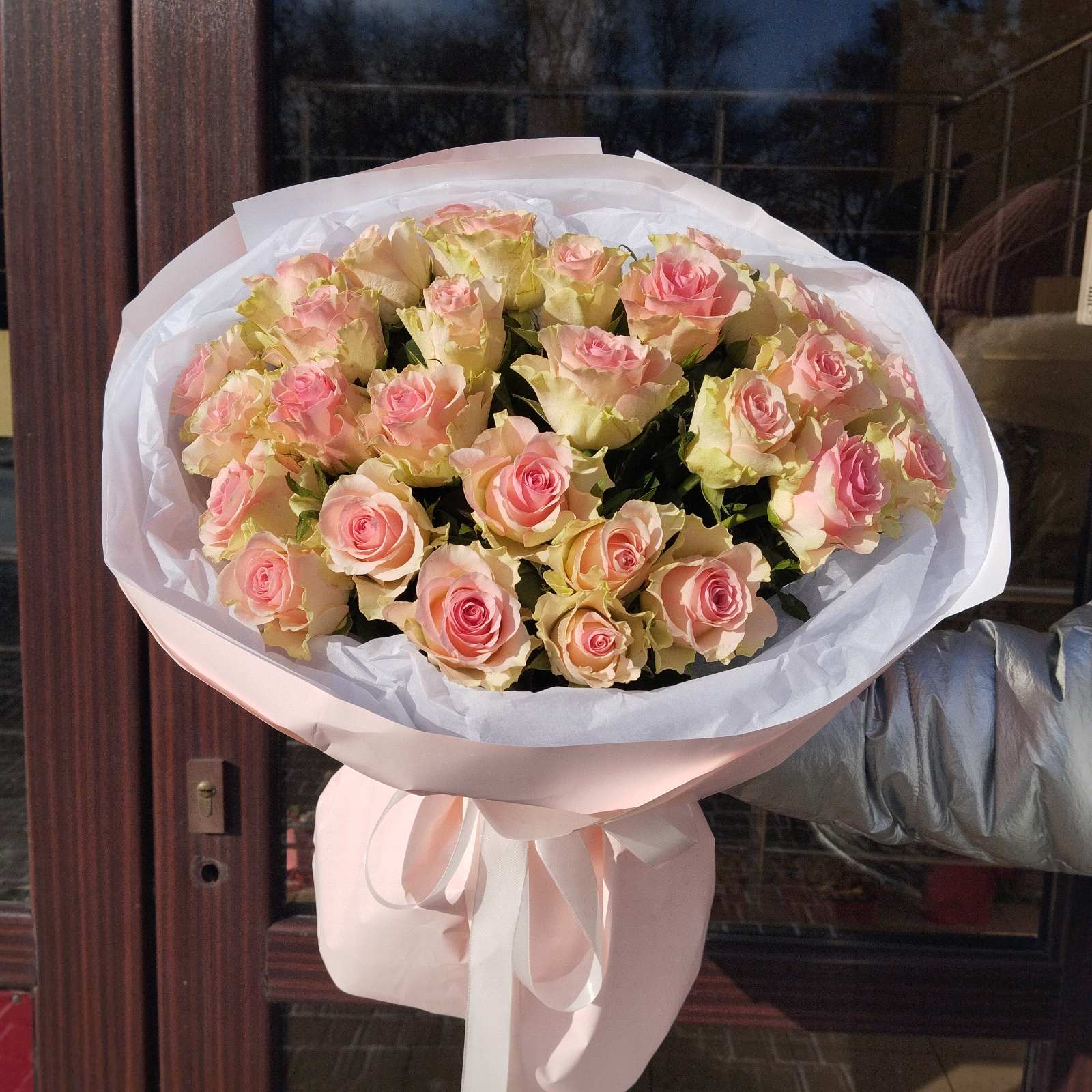 Розы со стеблем стебля 50 - 60 см, в букете и с оформлением таким же нежным не оставят равнодушной ни одну романтичную душу