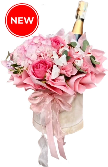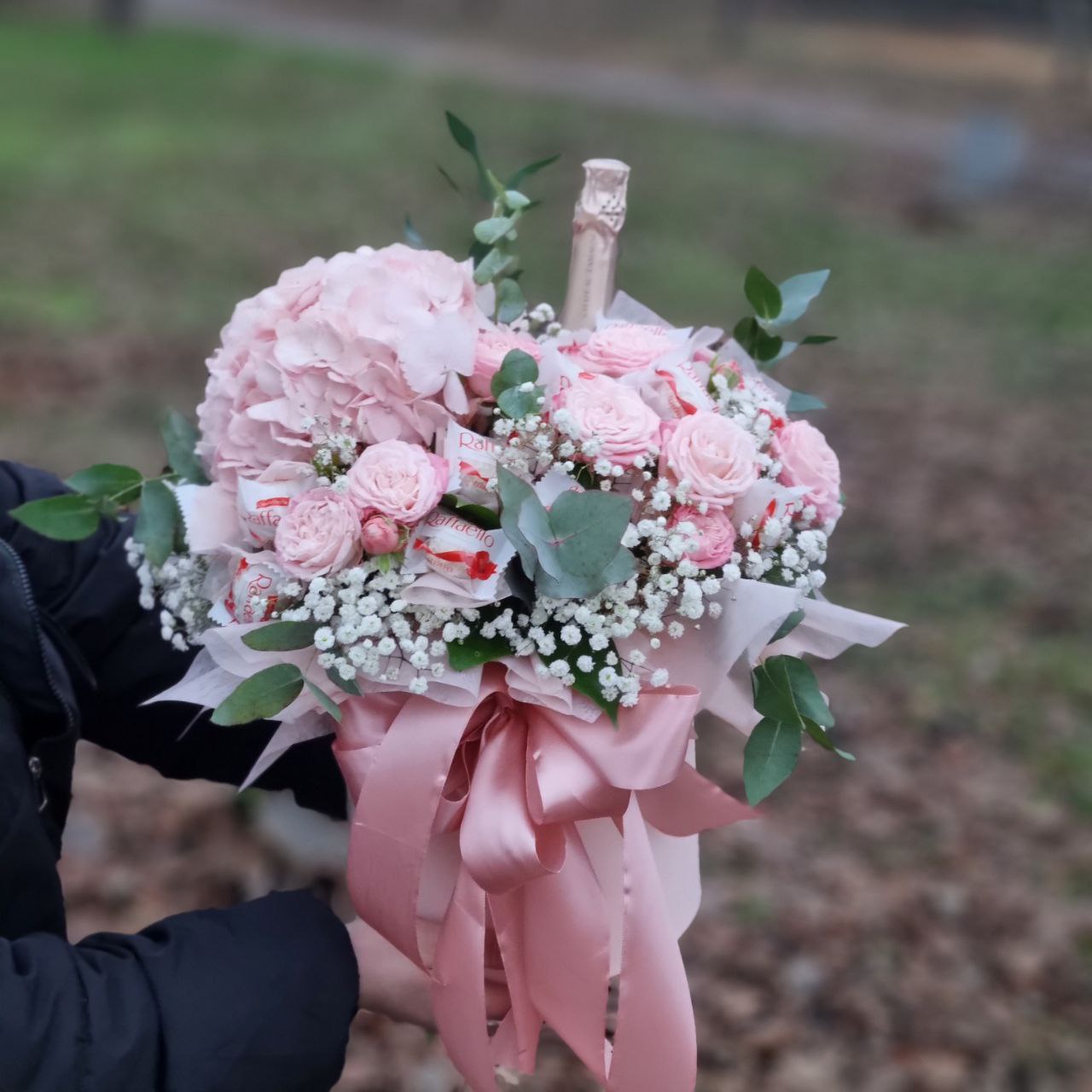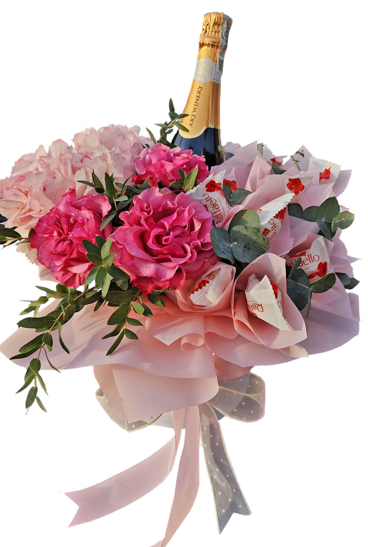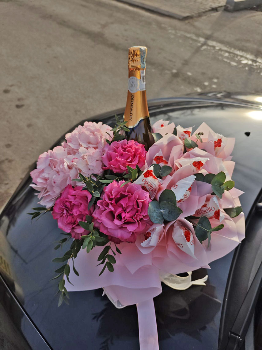 Эта композиция состоит как бы из 2 частей. В одной - прелестная цветочная композиция, в другой - шампанское и восхитительные конфеты Рафаэлло.