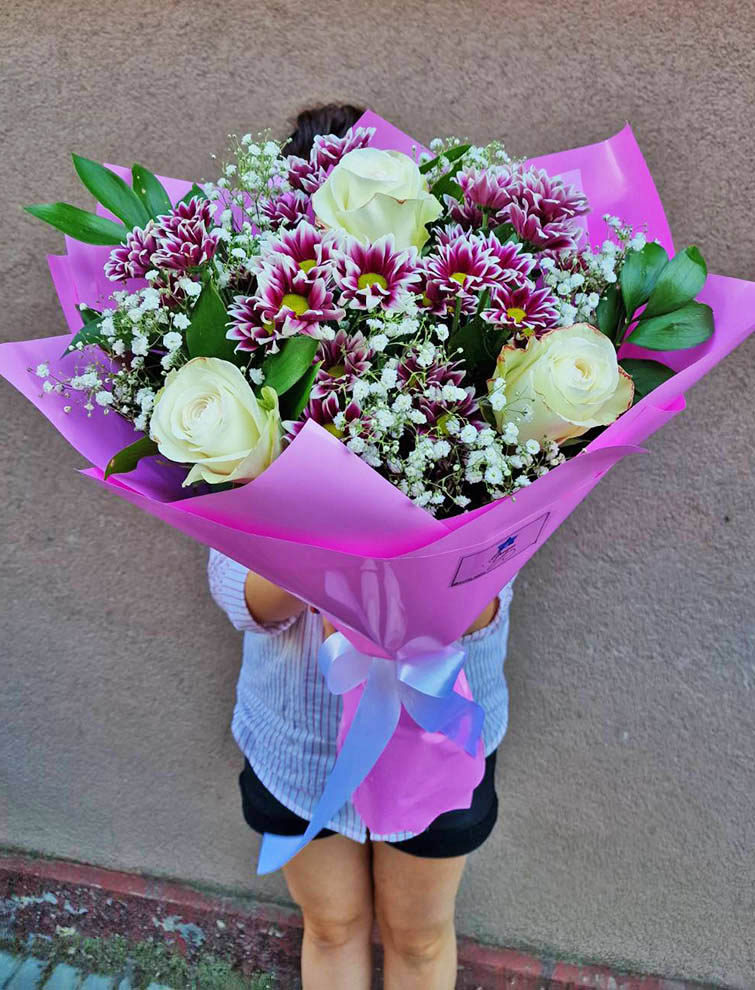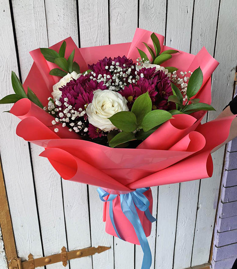 Элегантный букет из кремовых роз и ярких цветных хризантем в окружении белых очаровательных шариков гипсофилы.