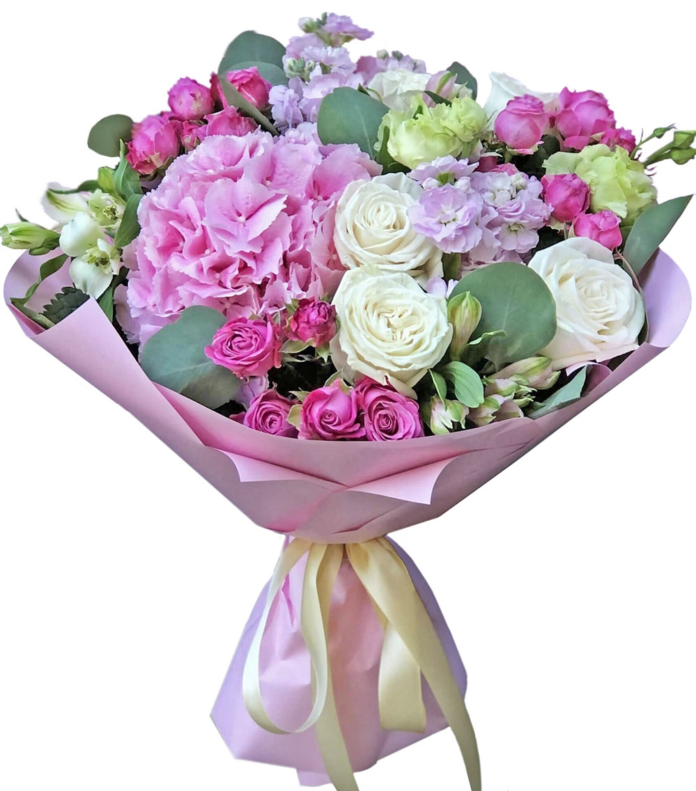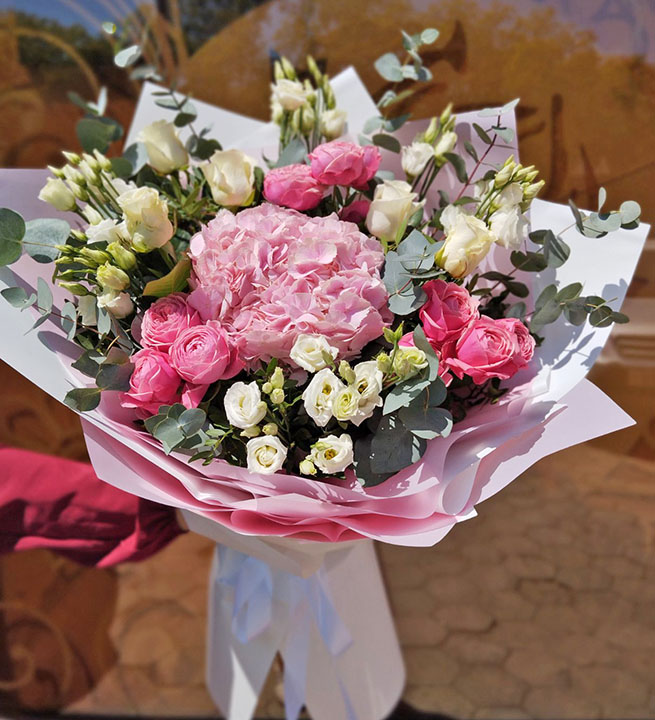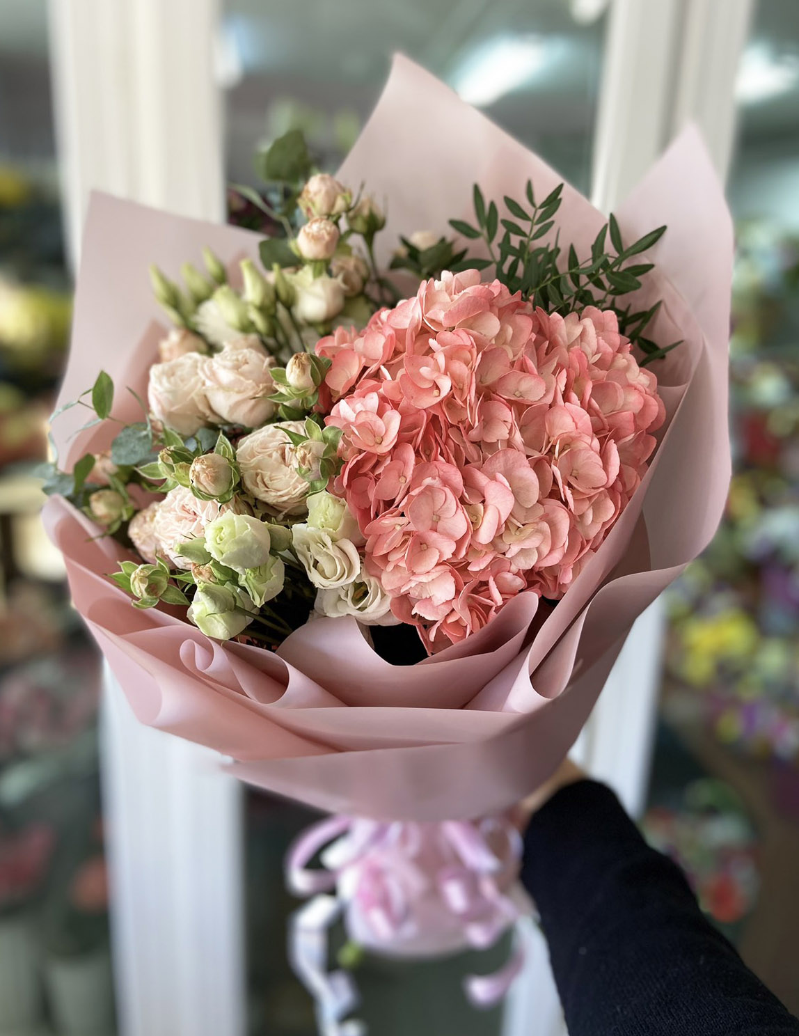 Цвета роз и эустом будут подобраны так, чтобы они гармонично сочетались с гортензией и вся композиция выглядела неотразимо.
