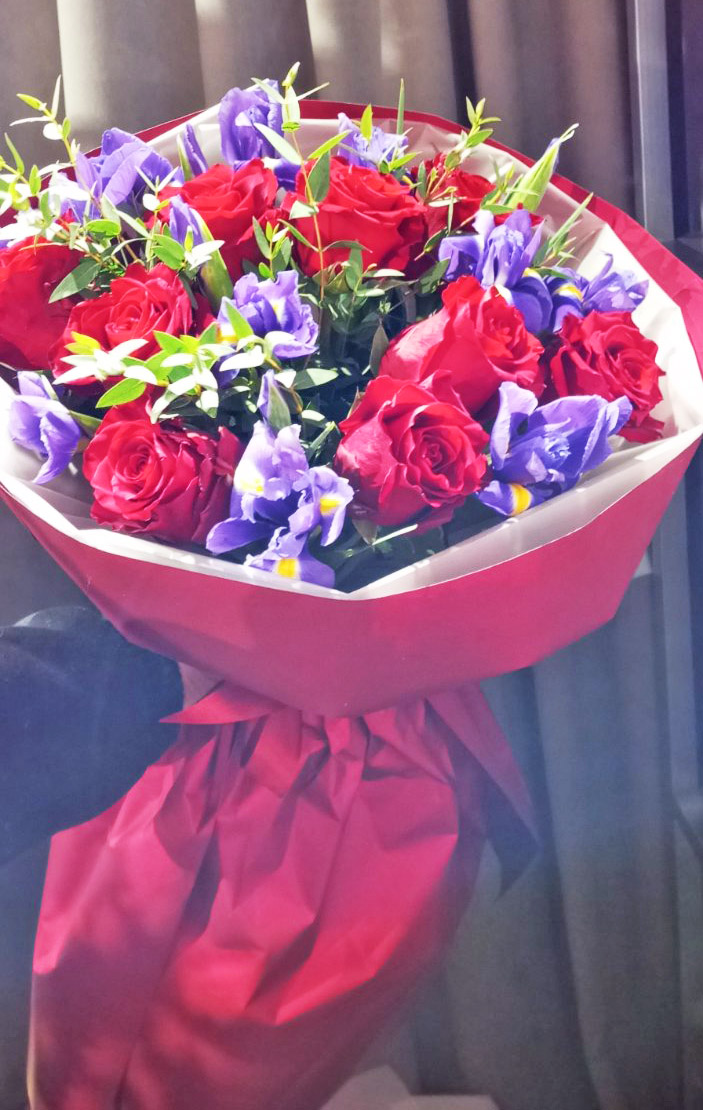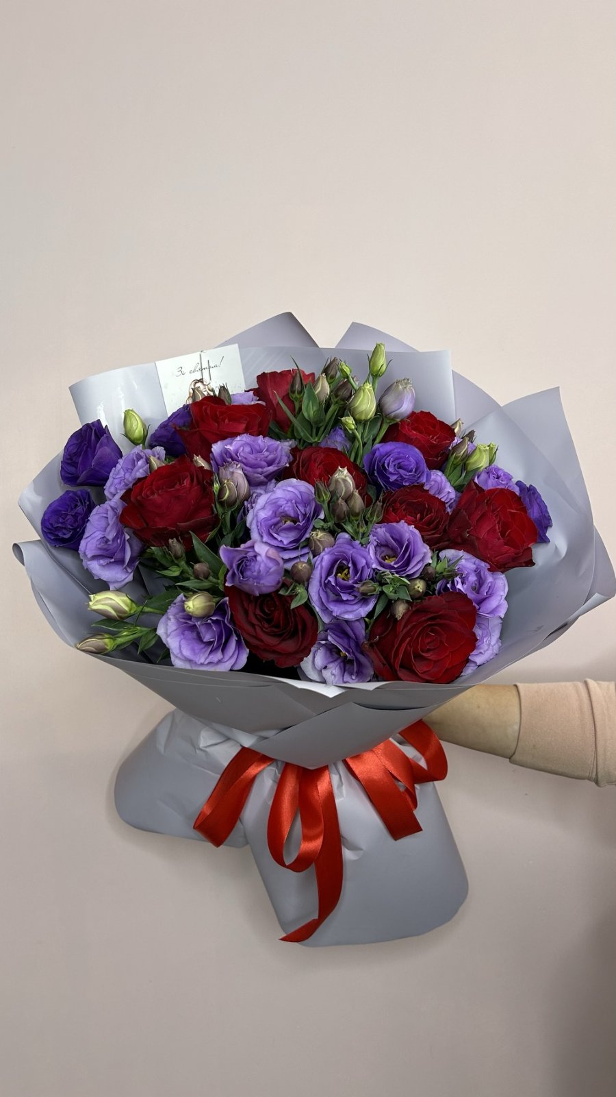 Впечатляющее сочетание цветов: красные розы и фиолетовые эустомы. В какие-то периоды вместо фиолетовых могут быть в наличии сиреневые эустомы. Букет с сочетанием красного и сиреневого будет ничуть не хуже!