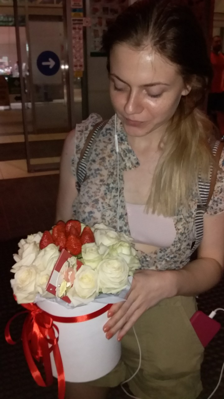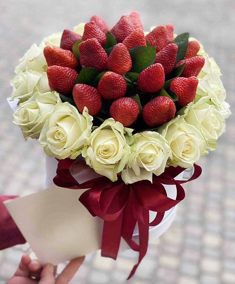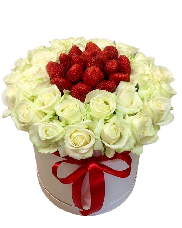 Композиция из белоснежных роз и сладкой клубники придется по вкусу романтичным и женственным натурам.