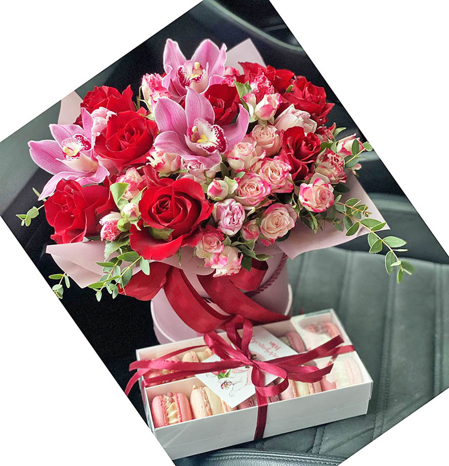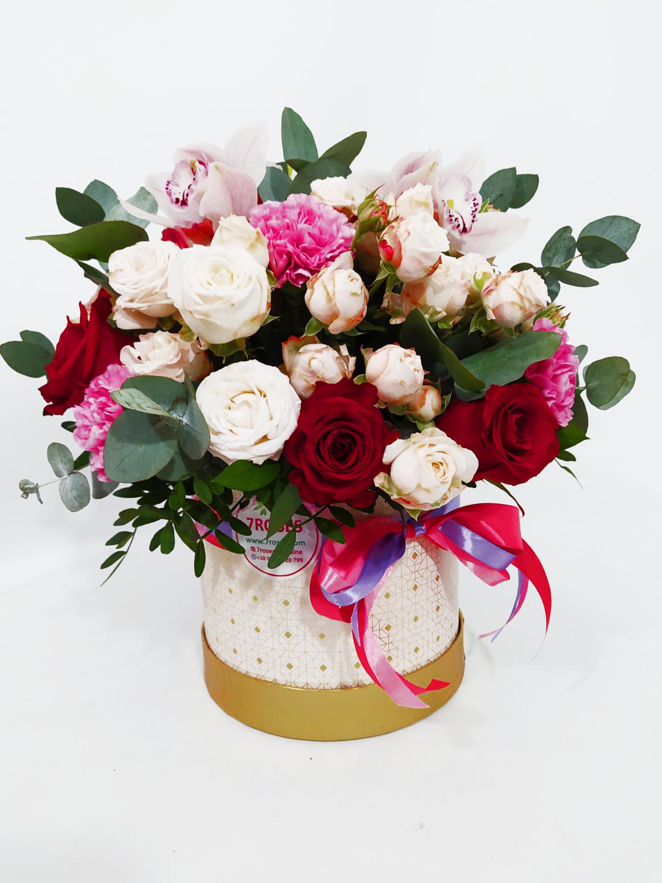 Цвет коробки может отличаться от того, что на нашем фото - это зависит от выбора коробок в нашем цветочном магазине на данный момент. Но мы подберем наиболее подходящий по цветовой гамме.