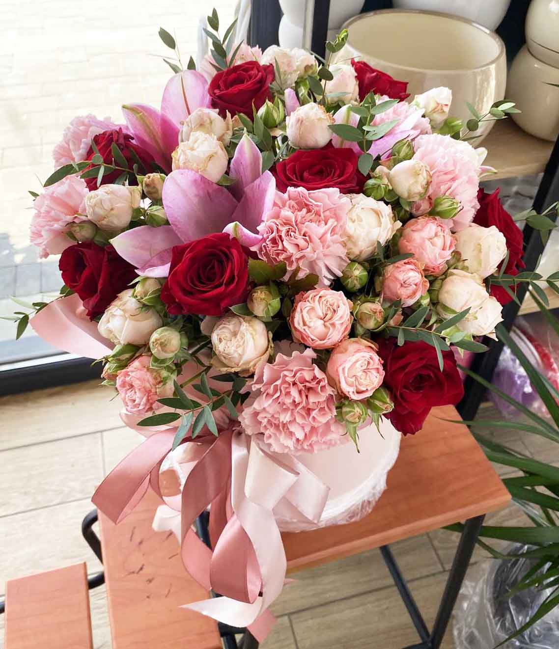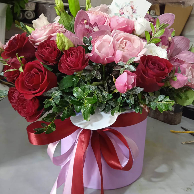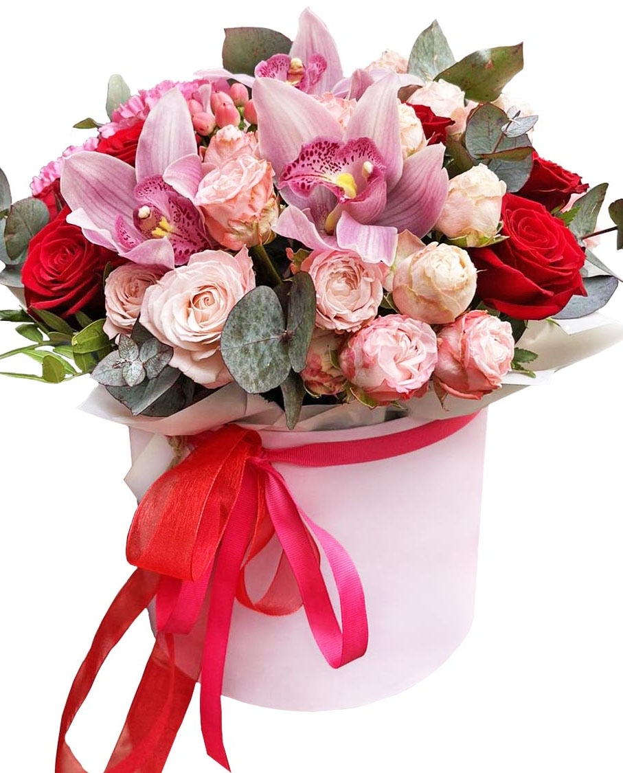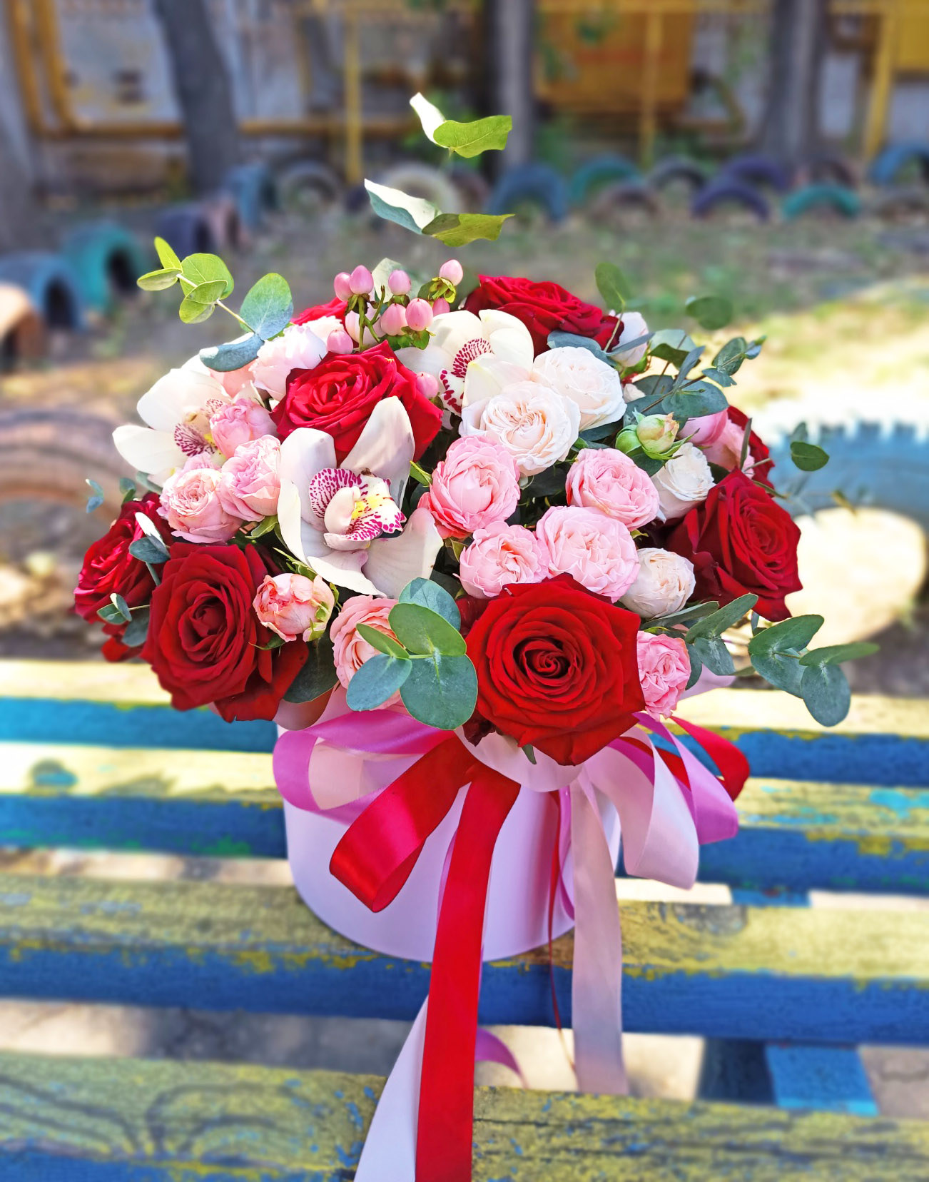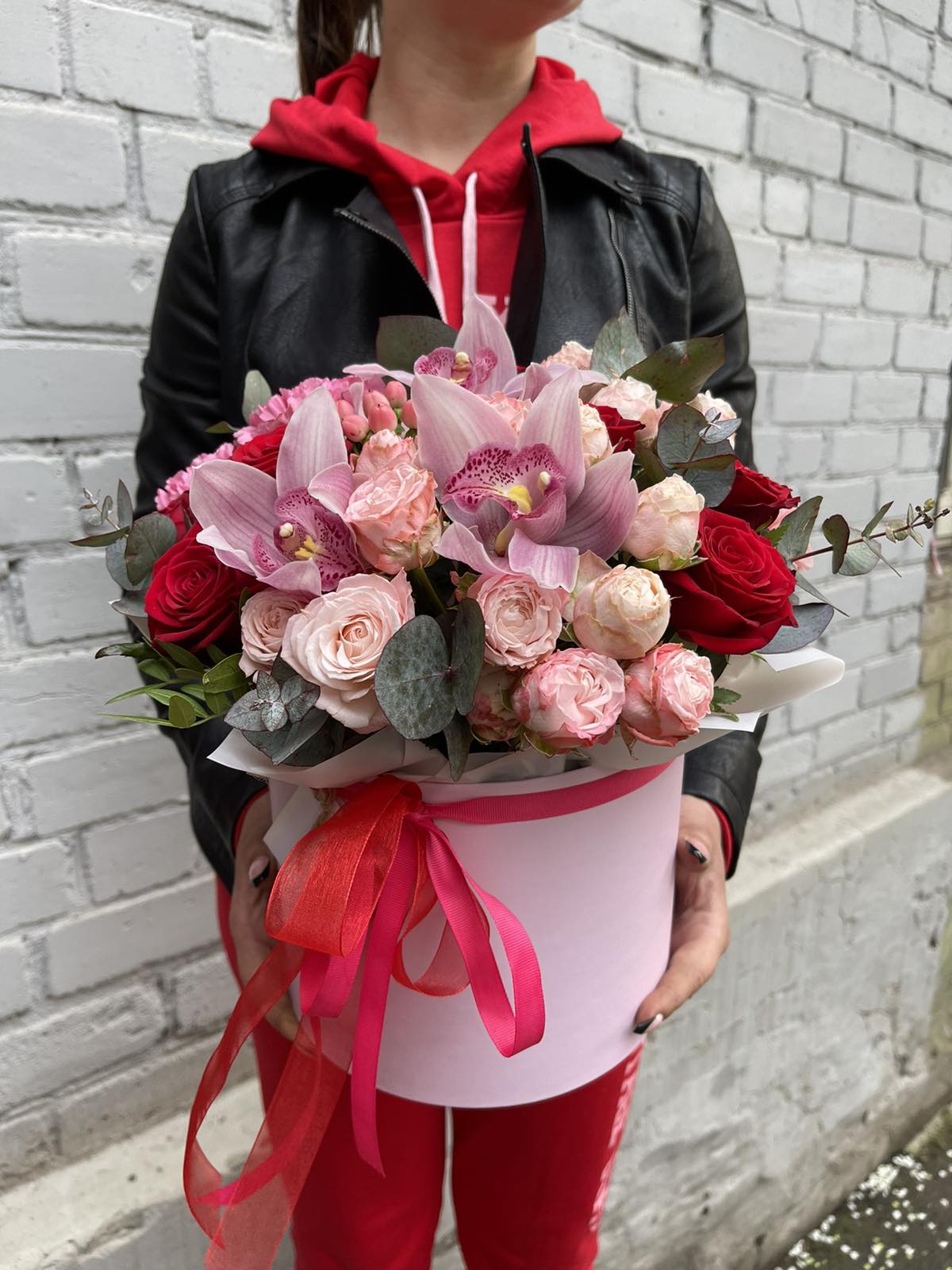 Нежная и романтичная композиция в шляпной коробке, выполненная из импортных цветов класса люкс (Голландия), в основном розового цвета с акцентом красных роз.