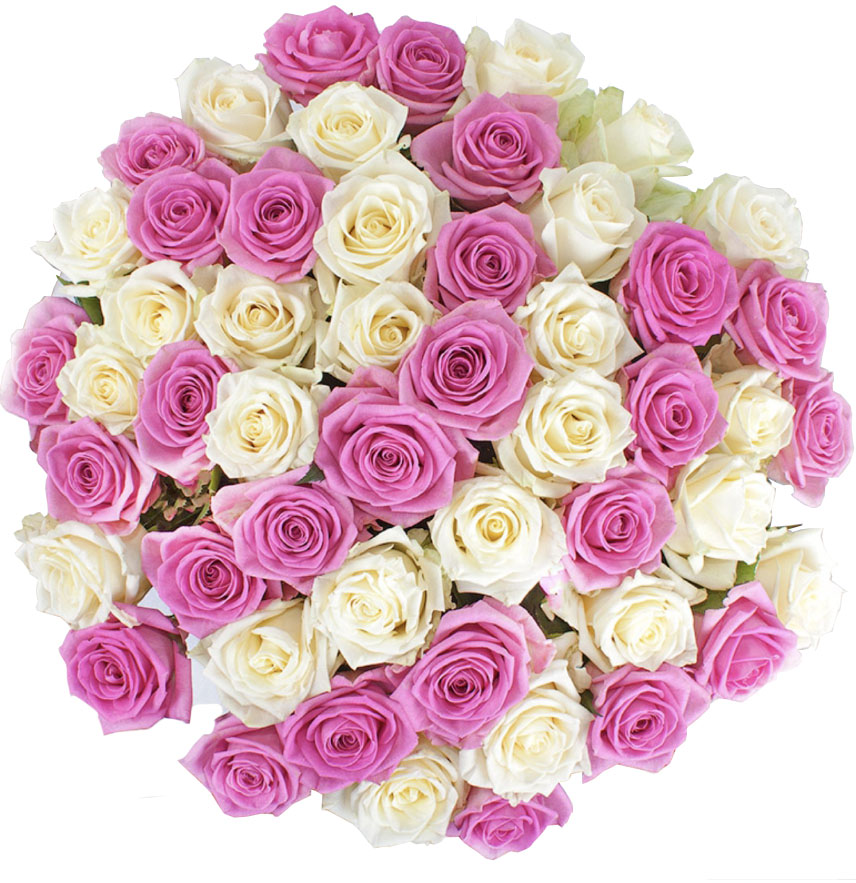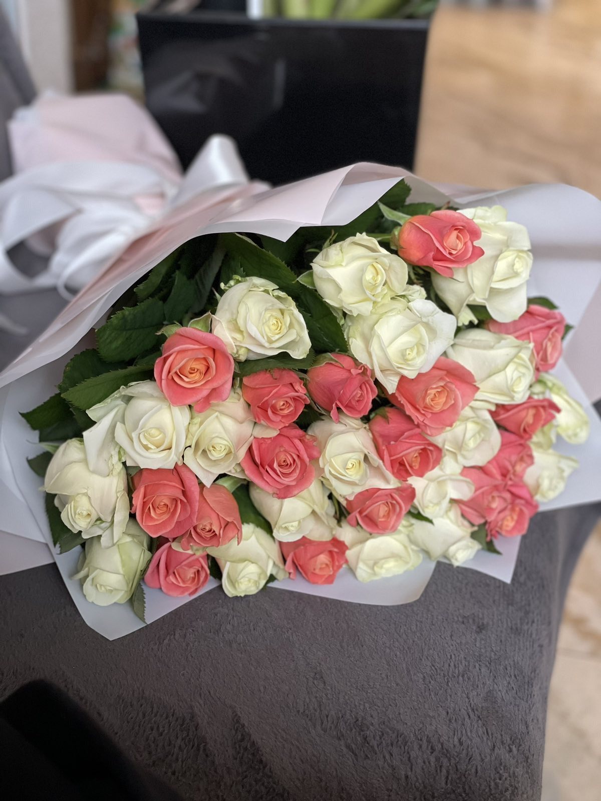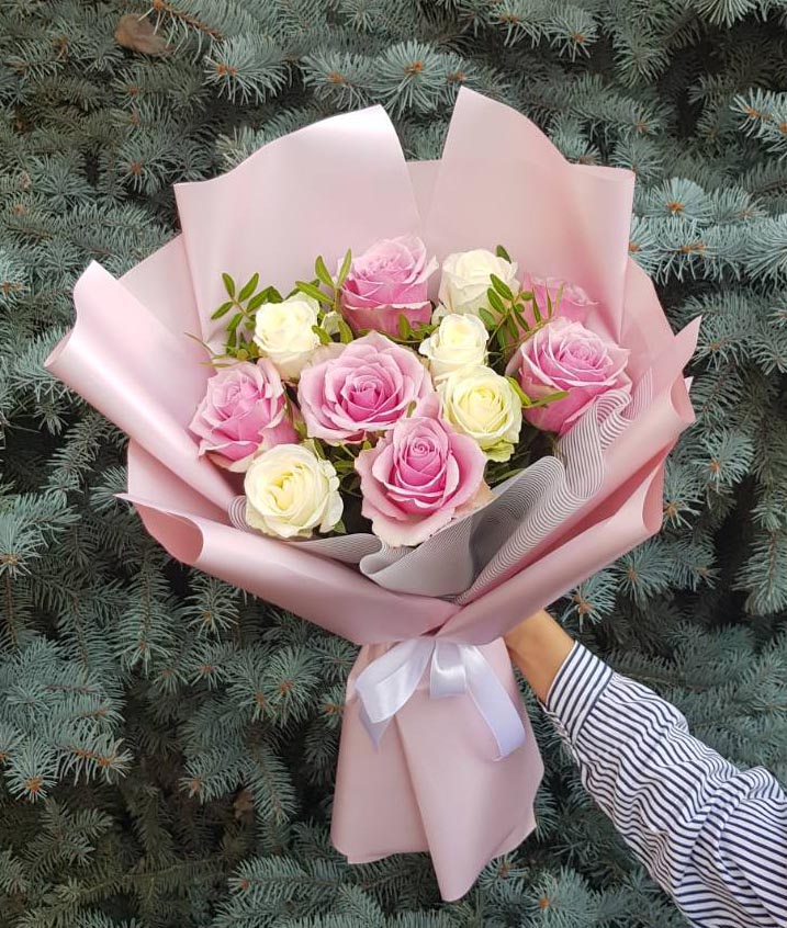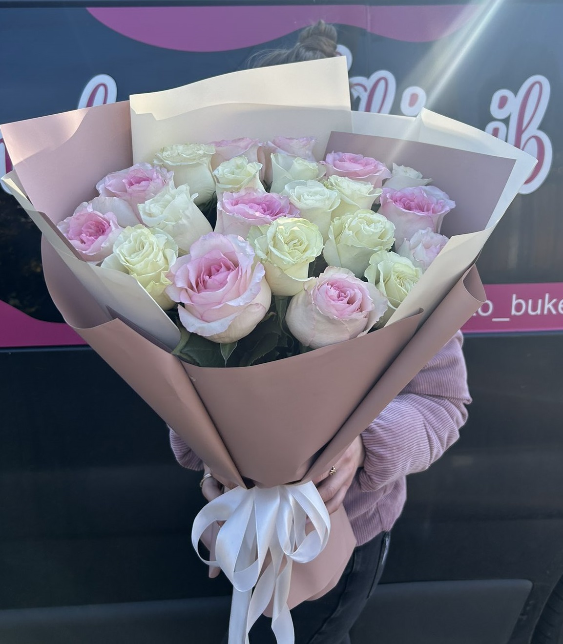Букет белых и розовых классических роз будет красиво оформлен в современную флористическую упаковку и подвязан атласным бантом.