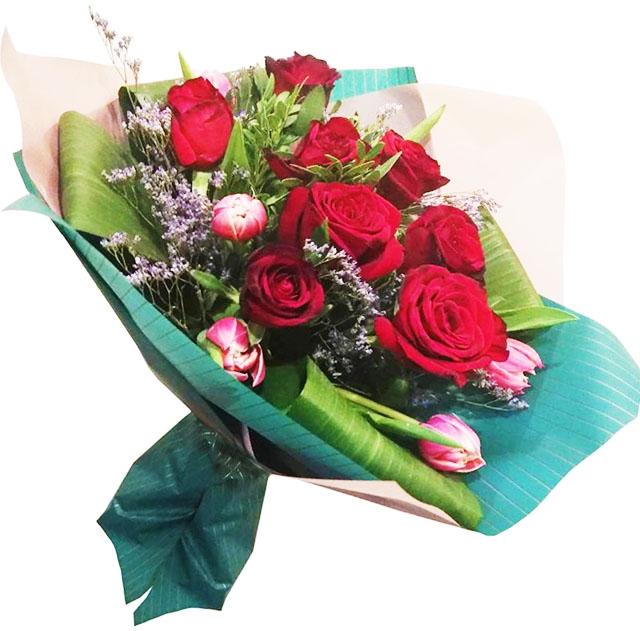 Пусть этот букет станет проводником в страну большой любви! Здесь 8 красных роз и 7 красных тюльпанов.