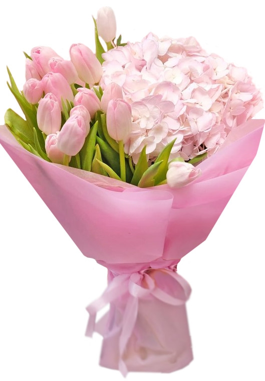 Большой шар розовой гортензии и 15 нежно-розовых тюльпанов...