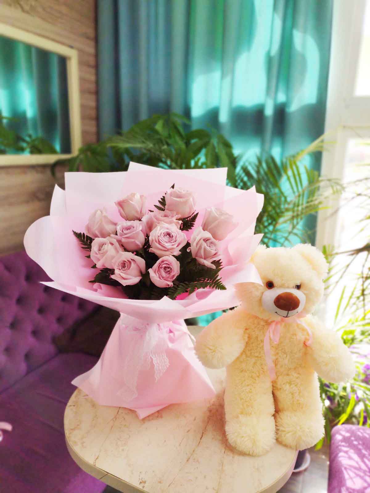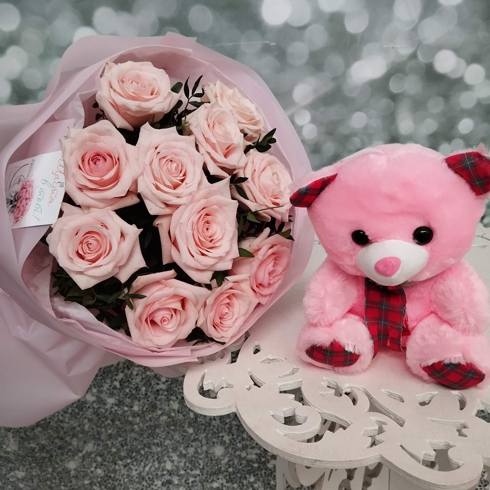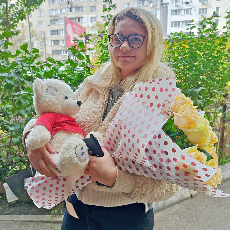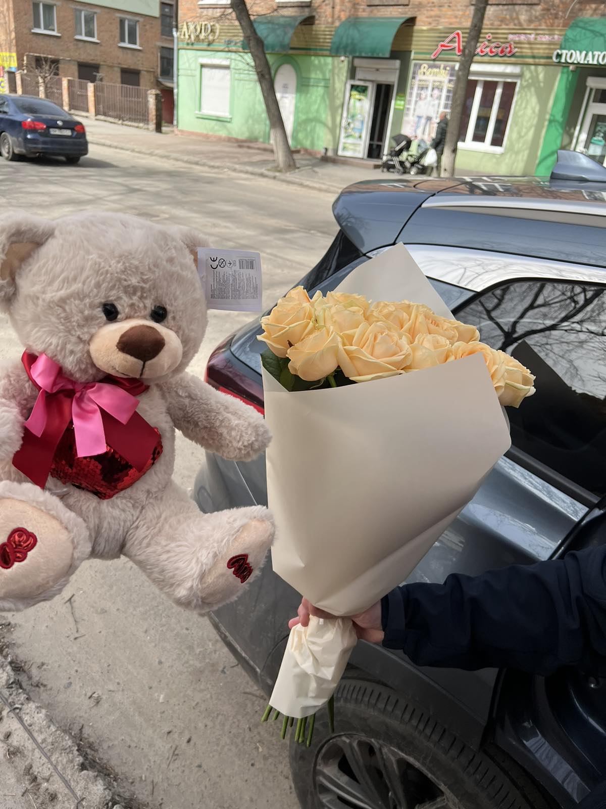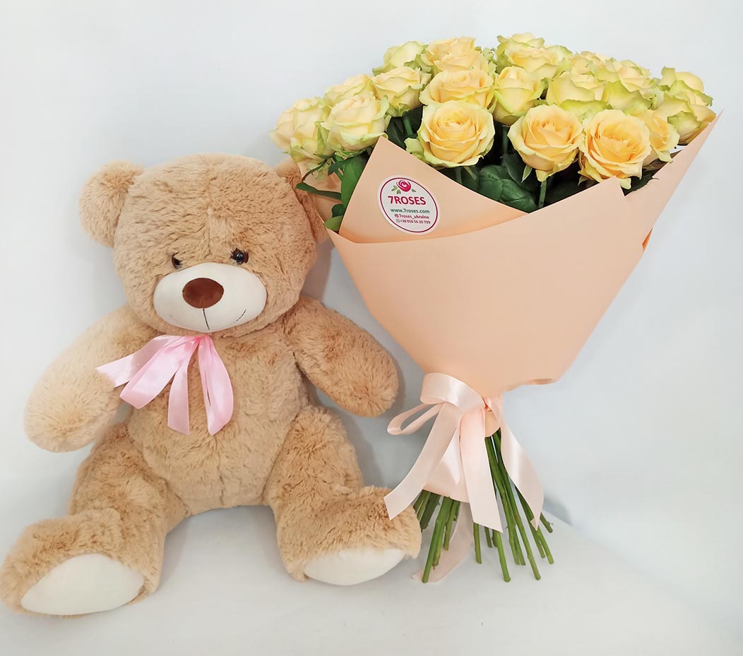 The color of the Bear can be different than the one at the photo: florists buy it at the local shops after getting a certain order. We select the most appropriate of those that are available at the moment. If you have any specific wish as to its color, please, write us at the "Comments" and we'll do our best to follow your wish if only there is a chance!