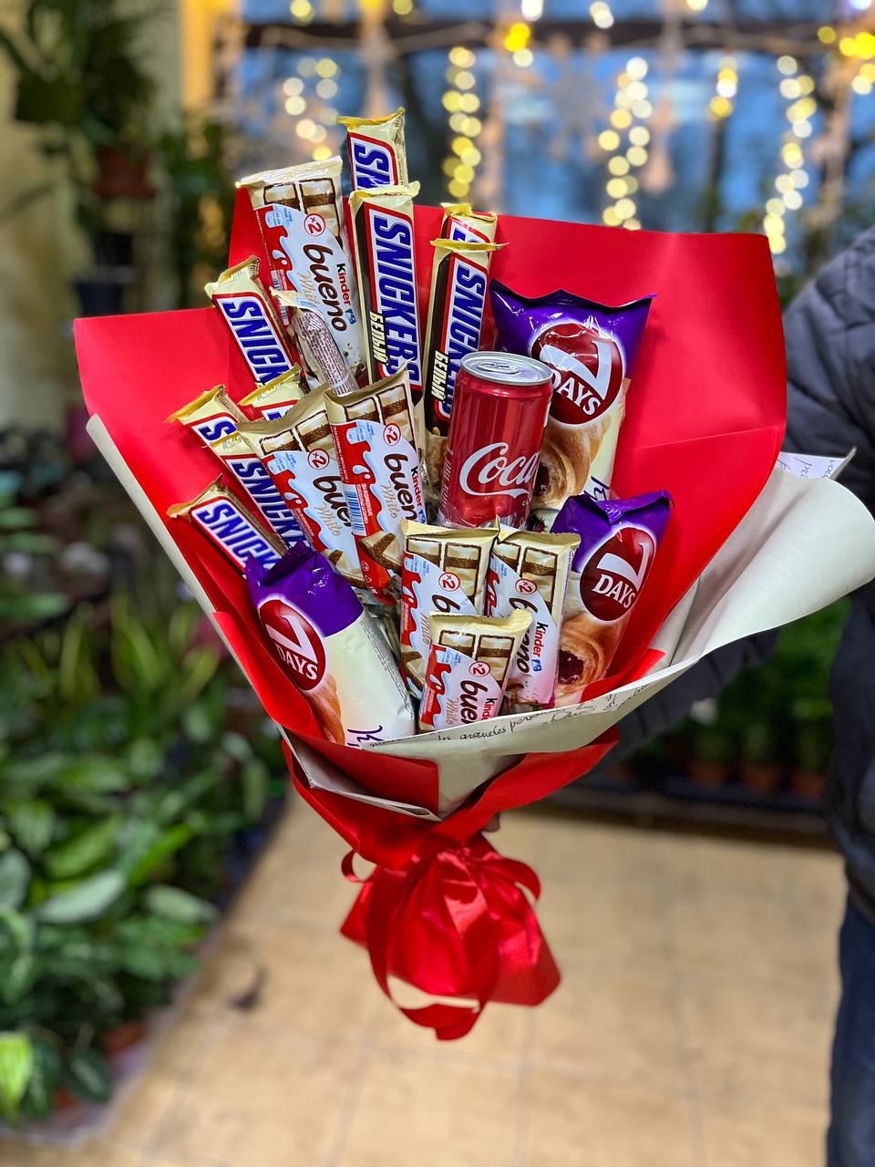 A Large Bouquet composed with chocolate bars, chocolate cookies and Coca-Cola cans or bottles.