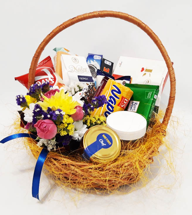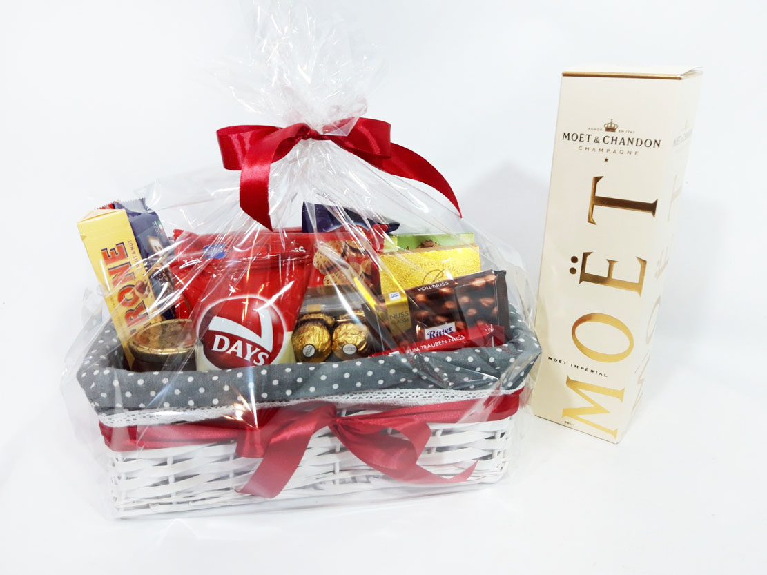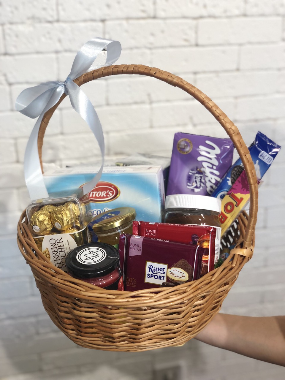 includes chocolate bar, candies, pastry, biscuits, jasmine green tea,