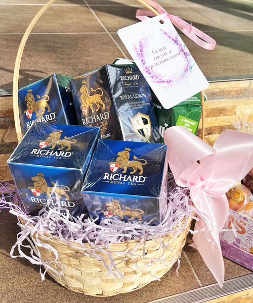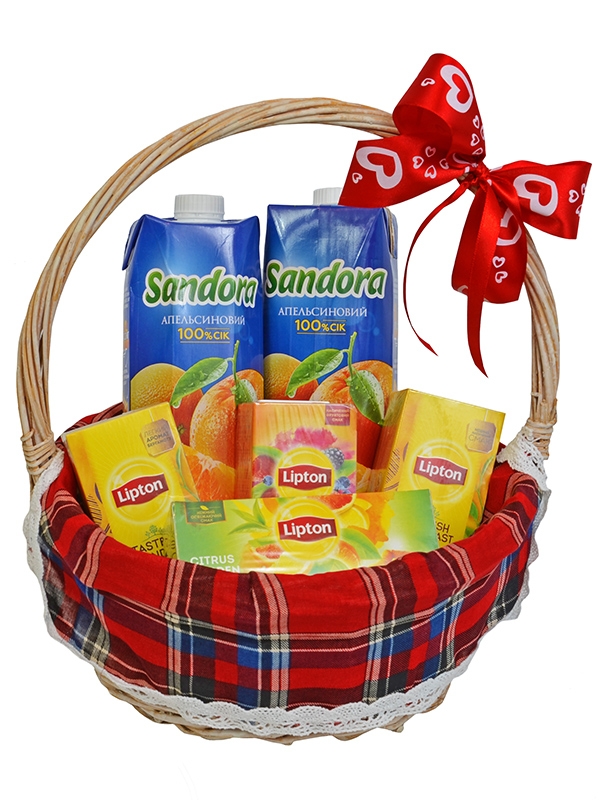 Give all the joy of the good morning and good mood to your dear and beloved. 4 packets of the most delicious and flavorful tea bags and 2 cartons of orange juice are beautifully arranged into the basket. These are all you need for vivacity, health and good mood!
