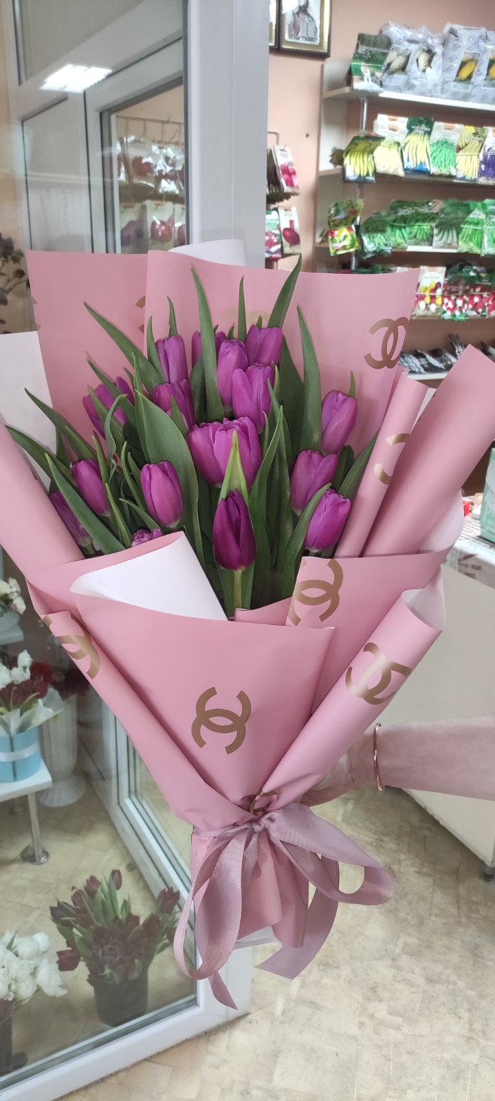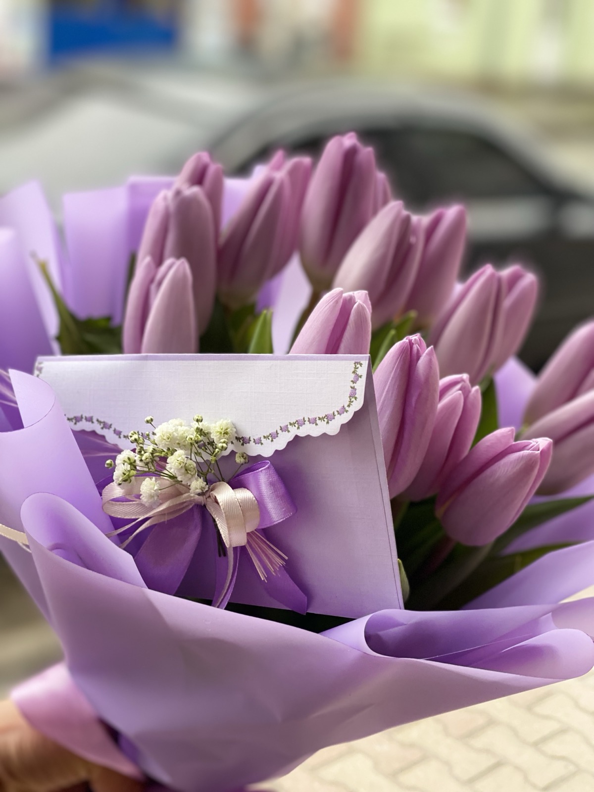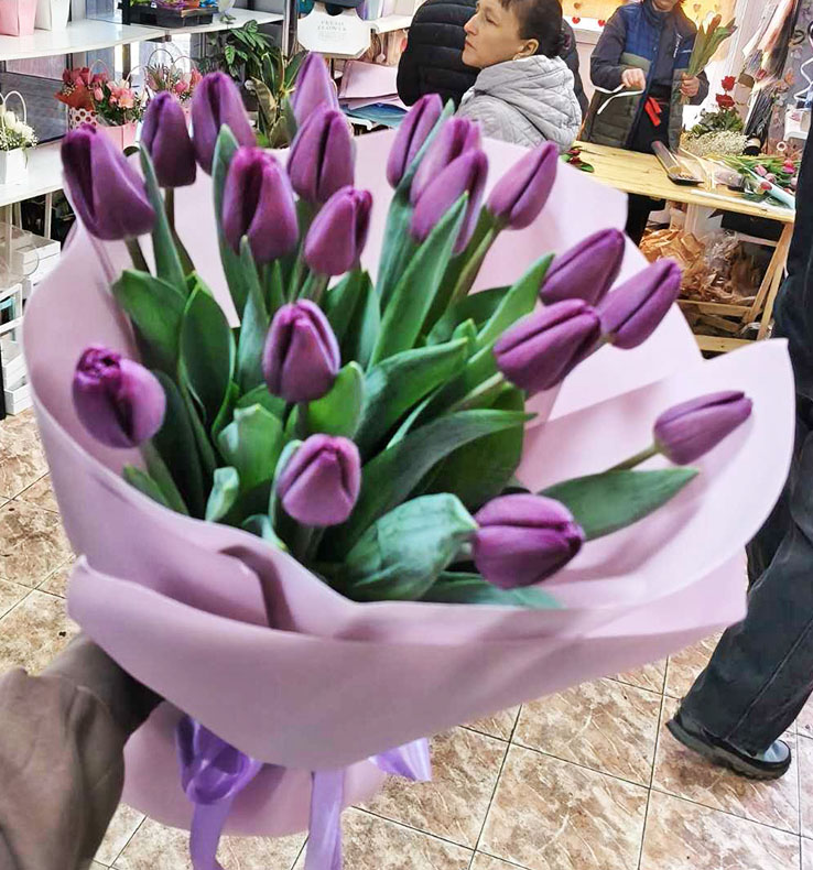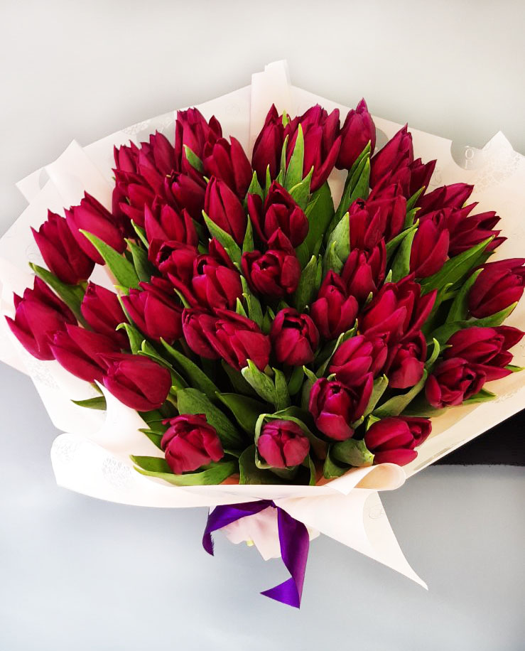 Our photo shows 51 tulips bouquet, but you could choose any other number of flowers for your bouquet.