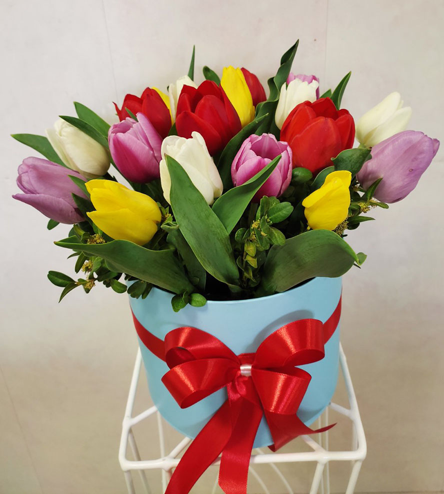 Our photo shown 27 multicolored Tulips arrangement, but we offer a smaller and bigger option.
