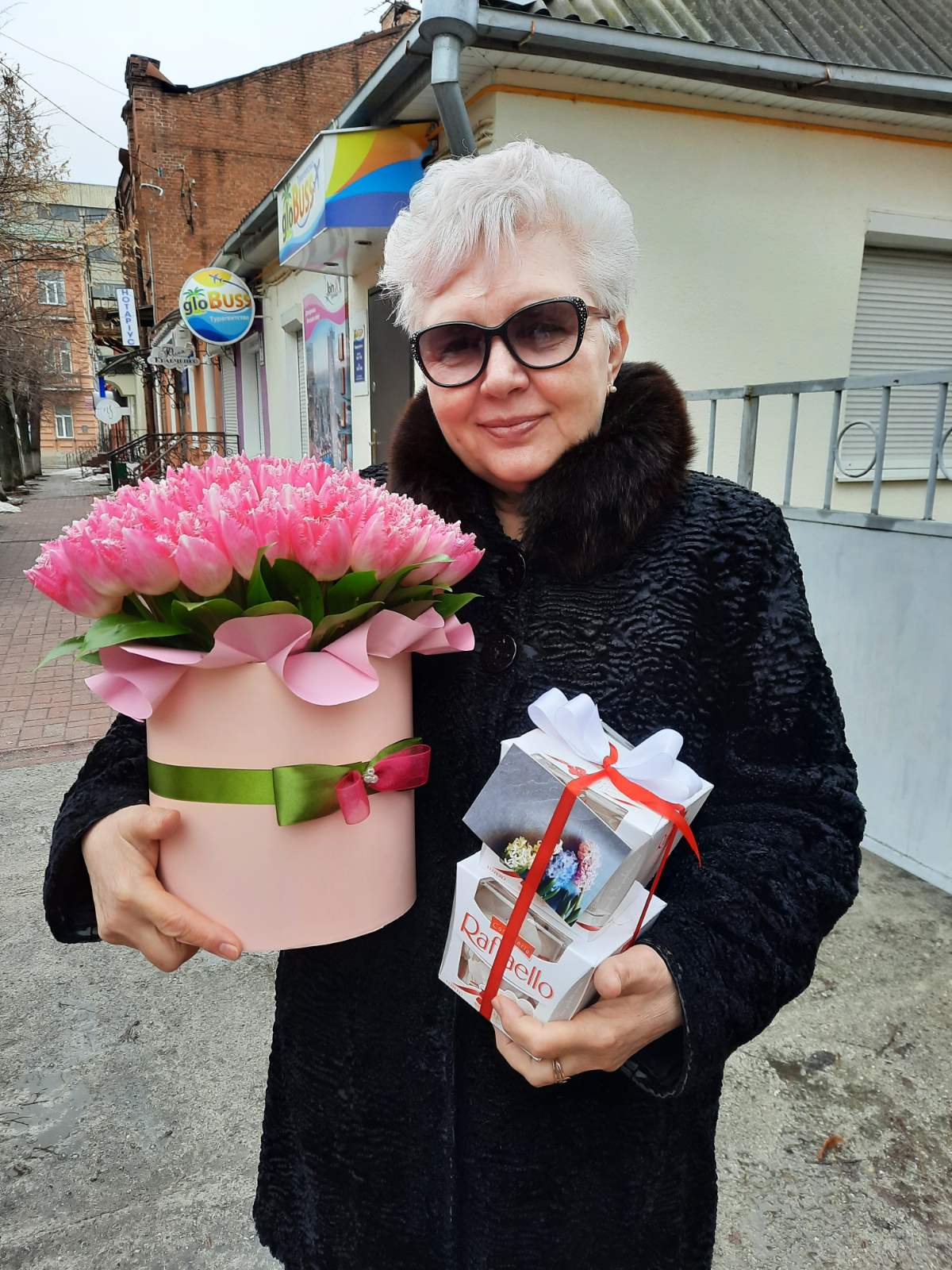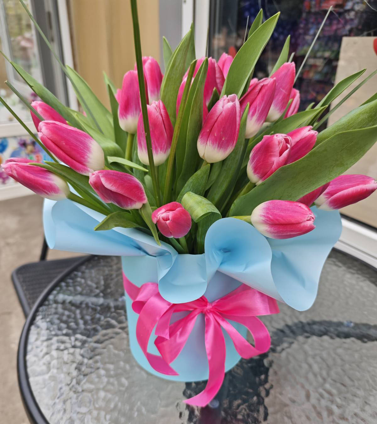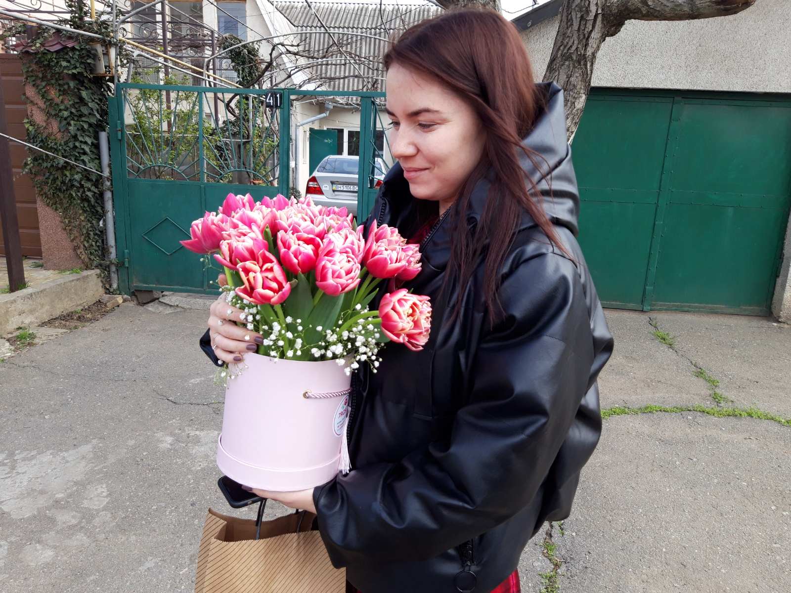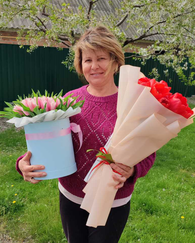 The "Pink" tulips color can be more or less bright than at our photo. It depends on the sort of flowers that arrive from suppliers at the moment.
