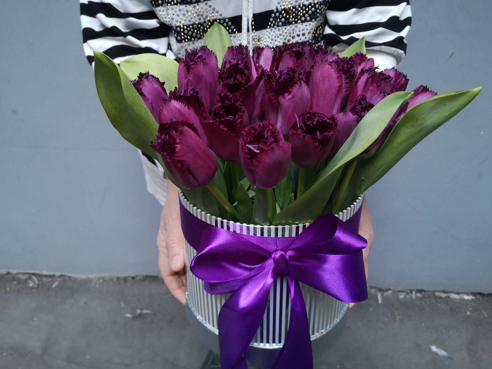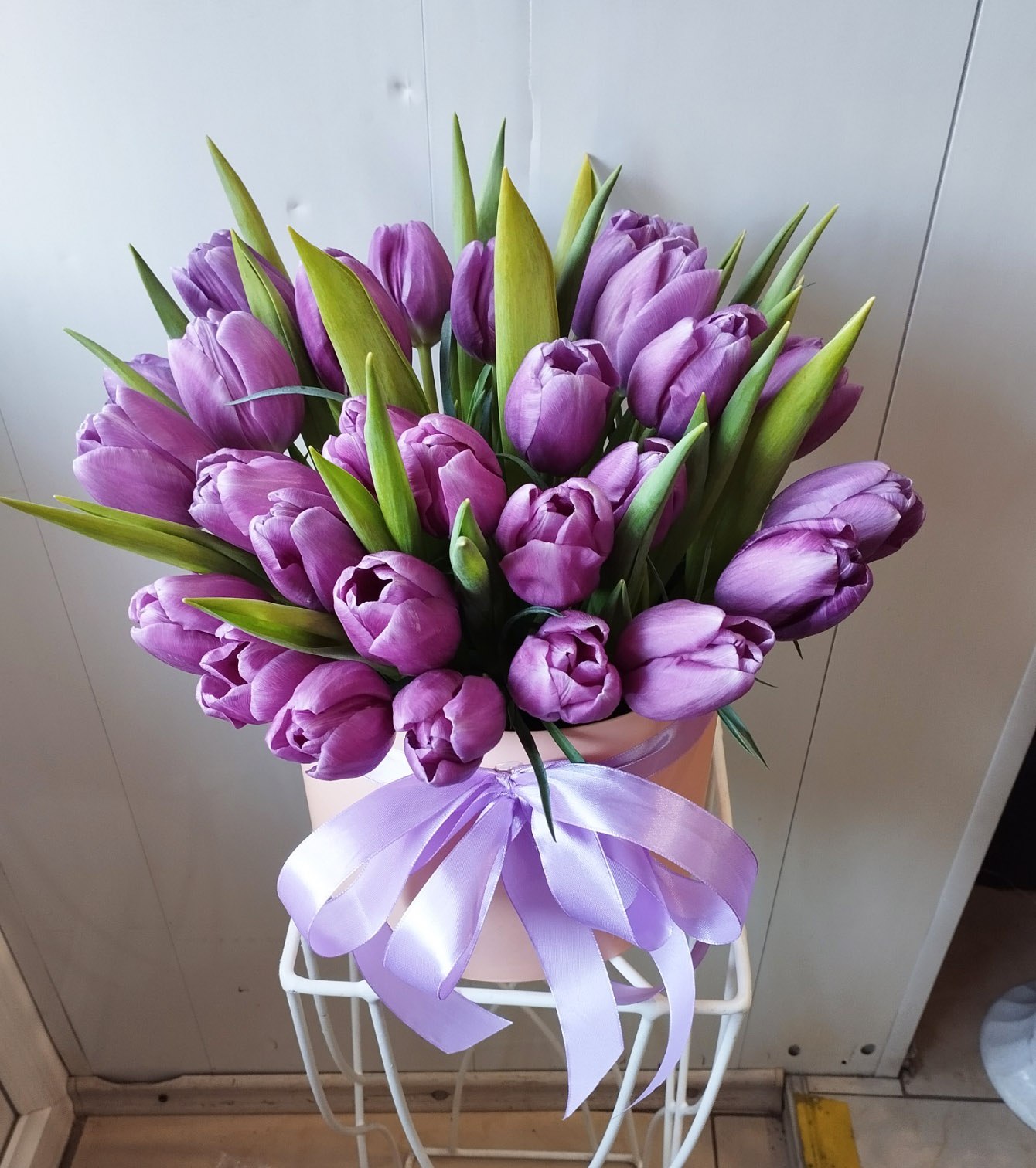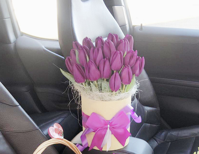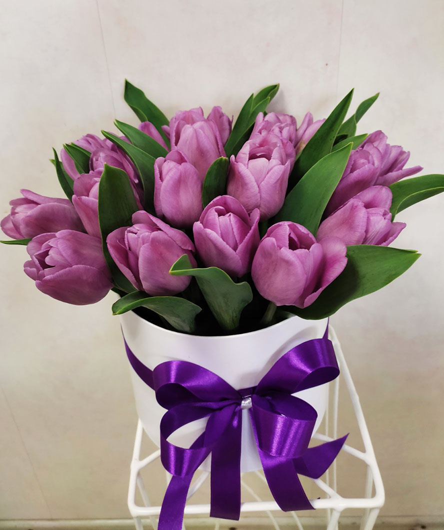 A purple-plum tulips at a hat box is available apprx from January-February to March-April - at the tulips blossoming season.