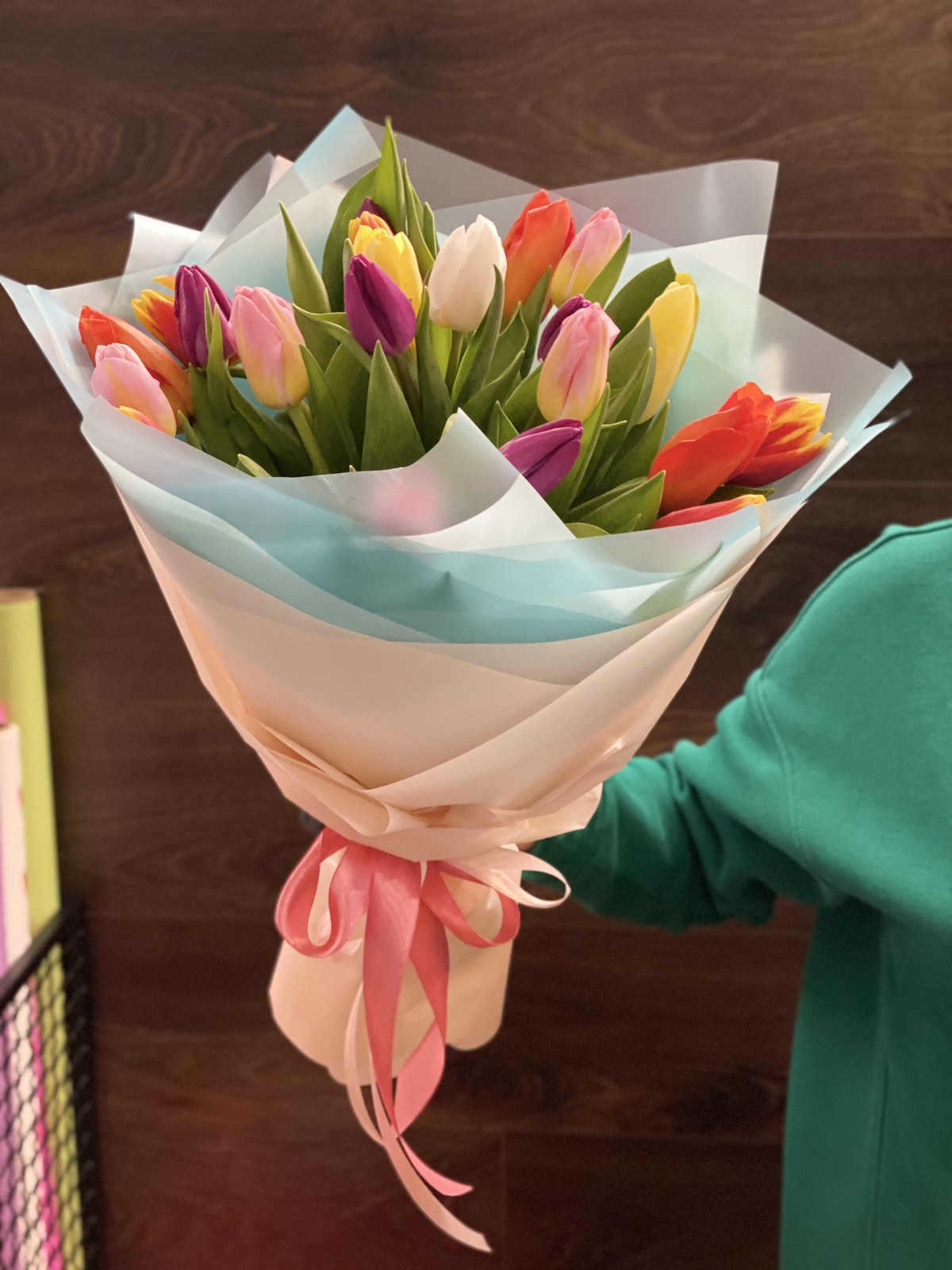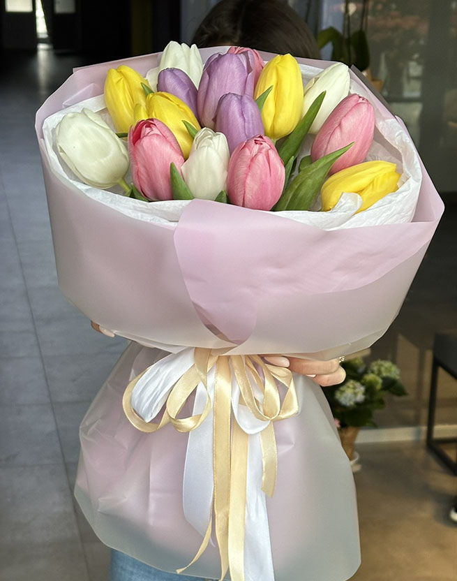 Joyful, sunny bouquet of multicolored tulips is available apprx from January-February to March-April - at the tulips blossoming season.