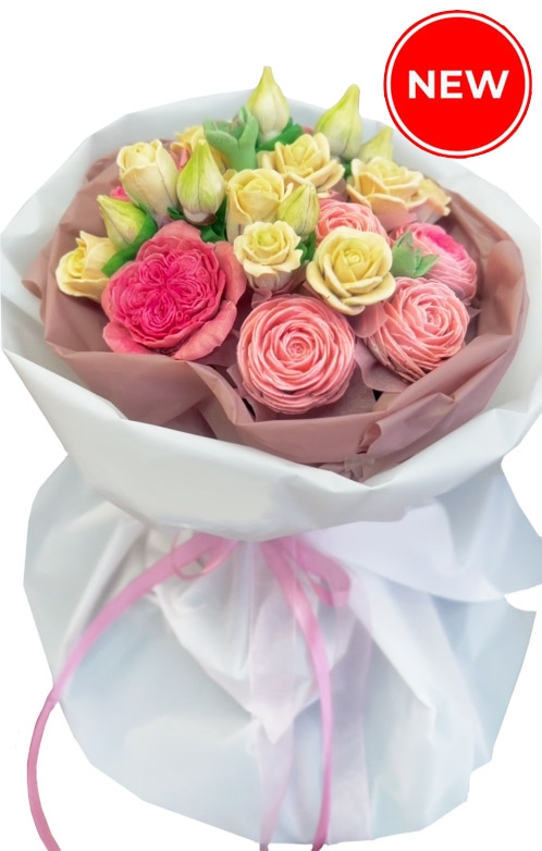 Воістину неймовірний подарунок! Мікс квітів, величезна різноманітність їх видів та відтінків. До речі, всі фарби повністю натуральні, отримані з овочів, фруктів і ягід. Композиція робиться в капелюшній коробці - так само, як оформляються живі квіти.