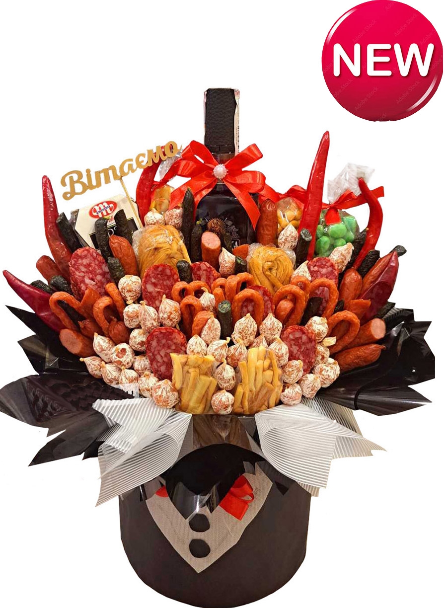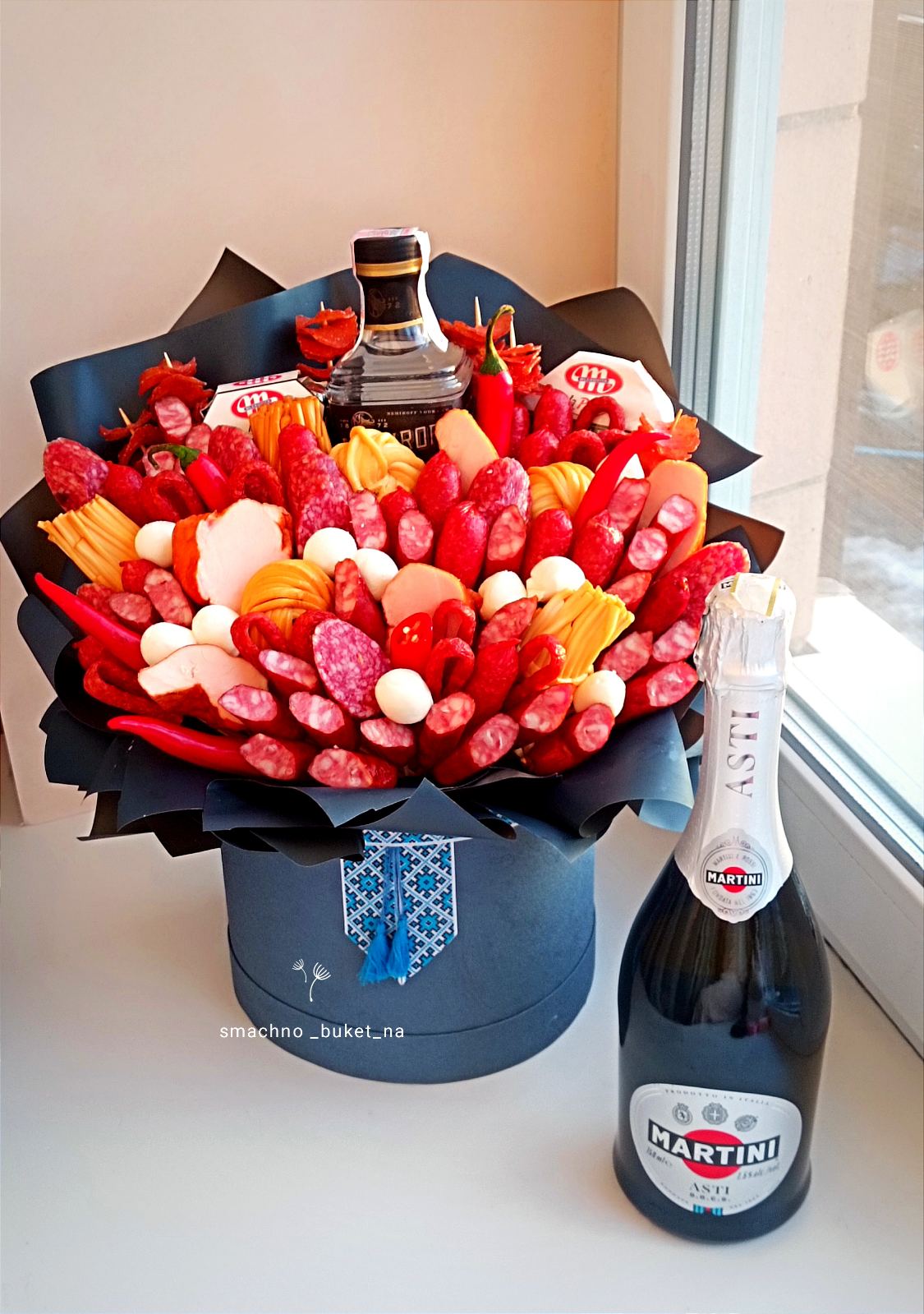 Прекрасний подарунок чоловікові до дня народження, ювілею, будь-якого сімейного свята. Набір з кількох видів ковбасок найвищої якості, сир, нарізка, горiшки... I все це прикрашають чудові стручки червоного перцю.