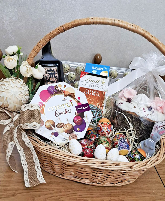 У цей подарунковий великодній кошик входять найтрадиційніші та найсмачніші для цієї події речі: