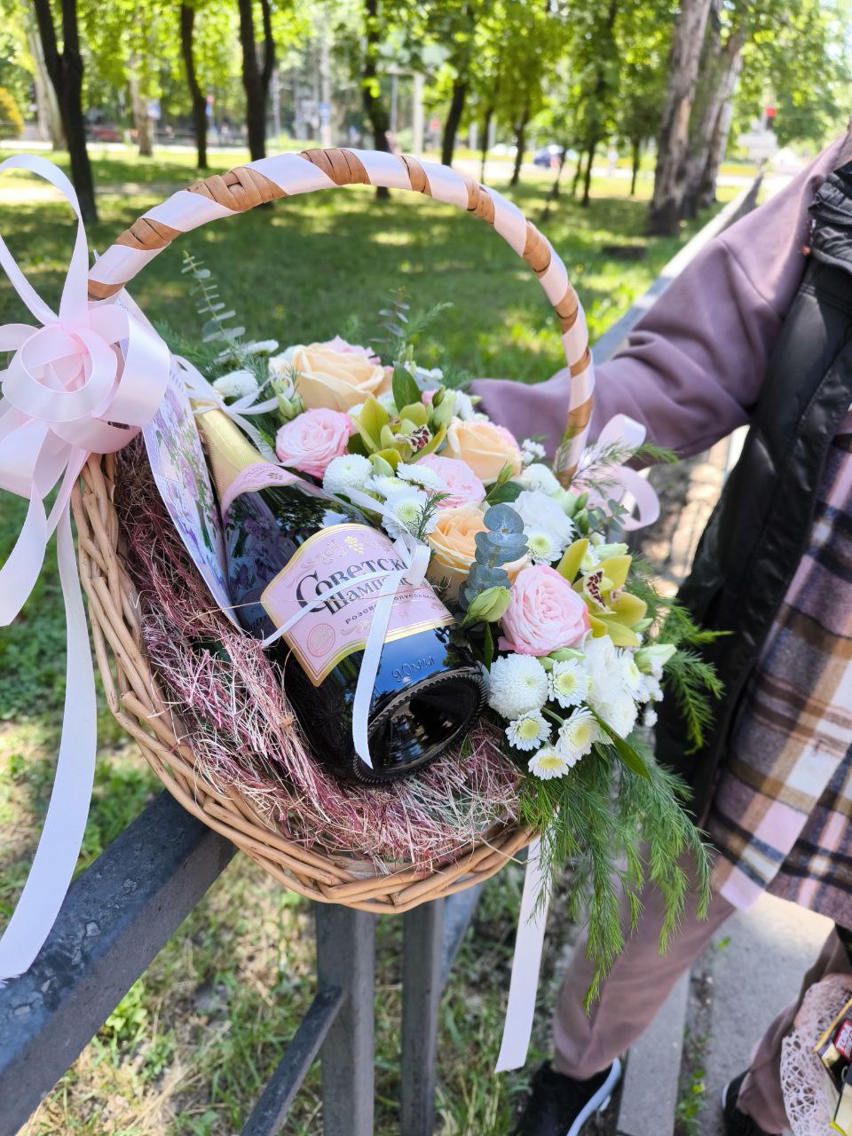 Подарункова коробка з українським шампанським та трояндами пастельних відтінків, іншими квітами, декоративною зеленню.