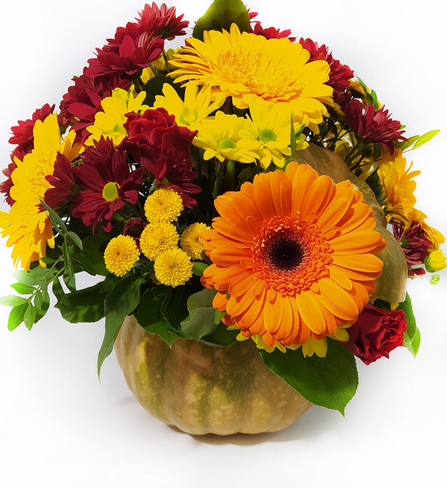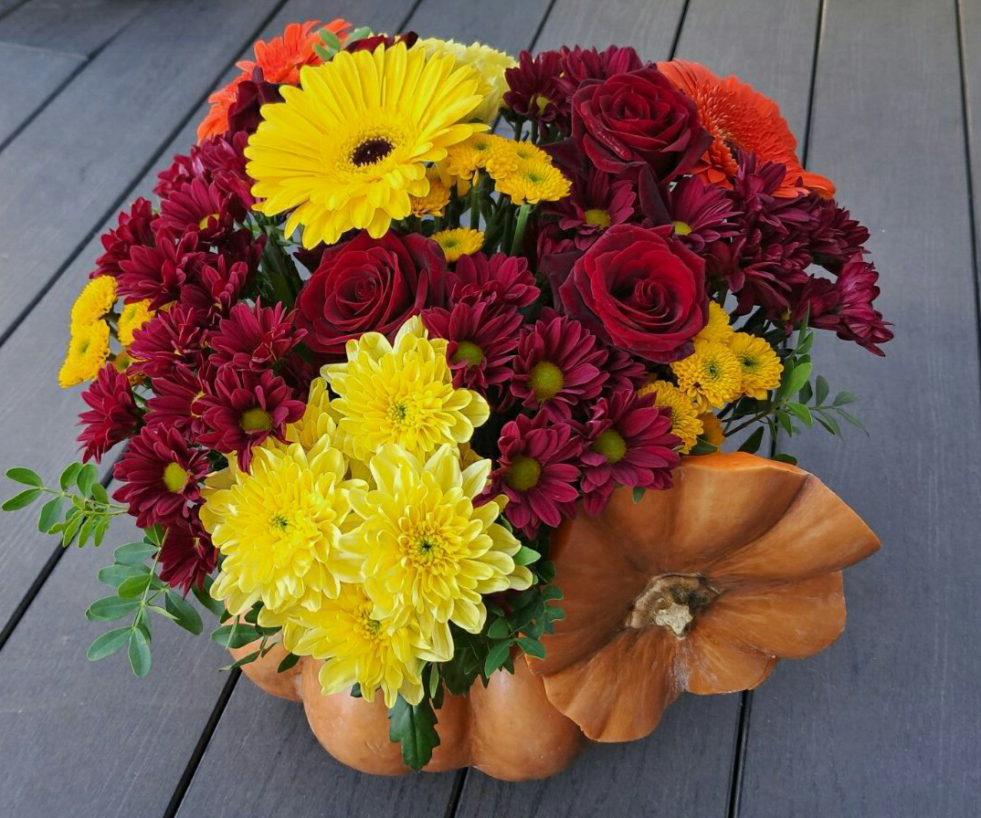 Композиція з осінніх квітів в помаранчевих і жовто-червоних тонах, в обрамленні осіннього листя, що вже почали змінювати свій колір з зеленого на жовтий і червоний, з включенням ягід помаранчевих або червоних - в гарбузі - чудовий, несподіваний, цікавий подарунок і для жінки, і для чоловіка.