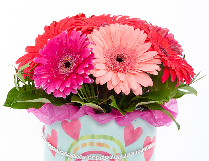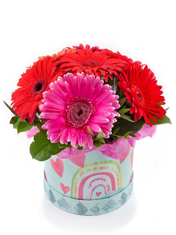 Ця яскрава композиція з гербер у рожево-червоно-малинових тонах в капелюшнiй коробці напевно підніме настрій і викличе вогник пристрасті у дівочому сердечку.