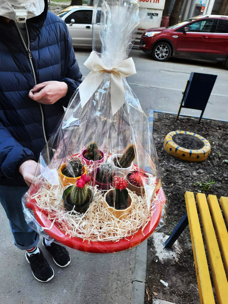 Тут колекція з 7 різних кактусів, щонайменше 5 з яких вже квітнутимуть, коли ми піднесемо її по вашому замовленню.