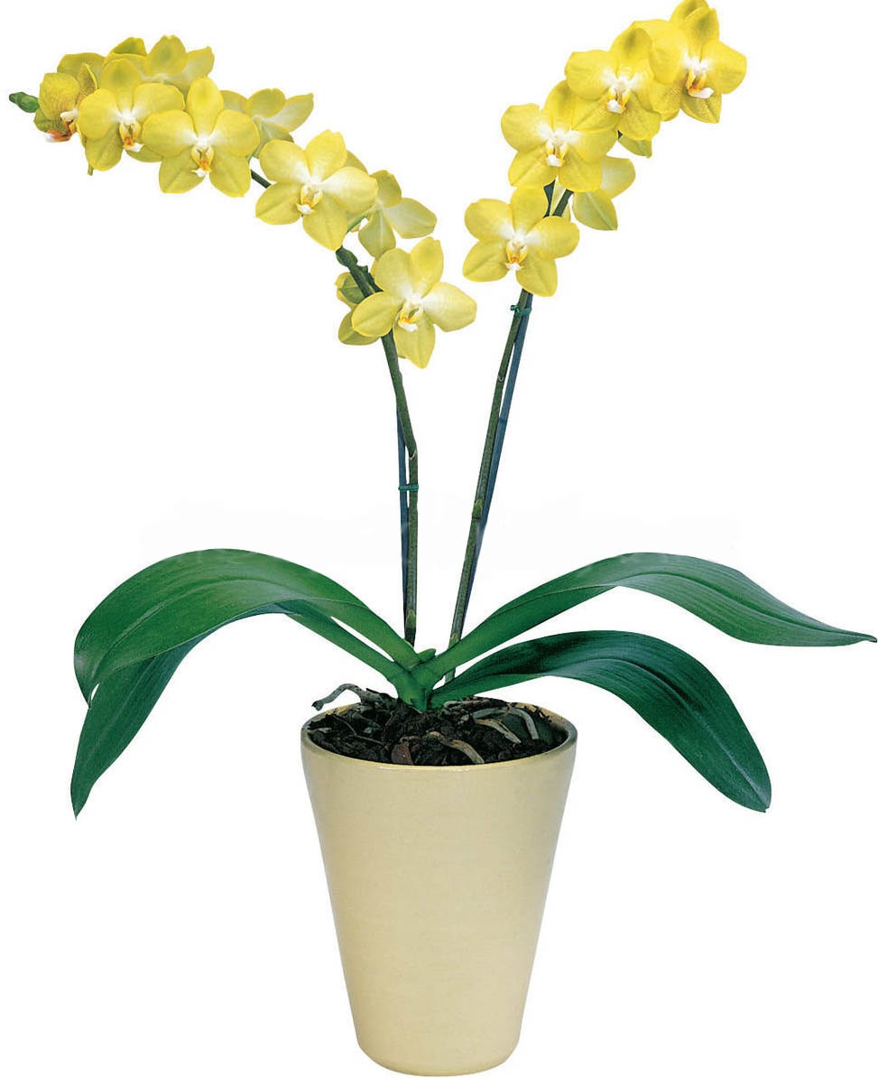 Жовта орхідея з 2-ма квітучими гілками у пластиковому кашпо