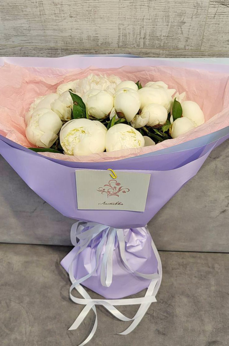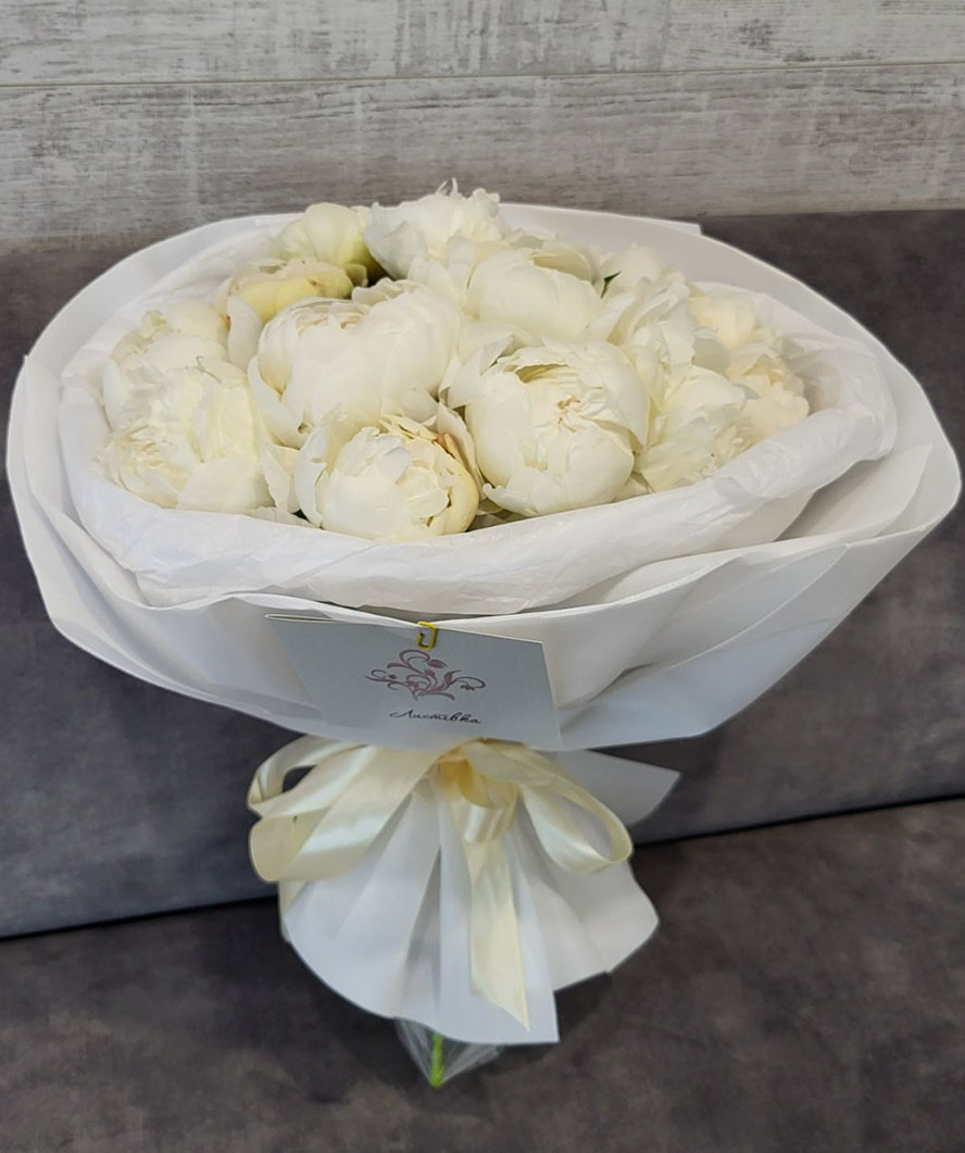 На нашій фотографії зображено букет з 15 бiлих півоній, але ви можете вибрати іншу їх кількість для своєї композиції. Але для презентації букет, звичайно ж, буде красиво і зі смаком упакований і підв'язаний великим атласним бантом.