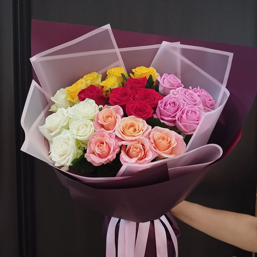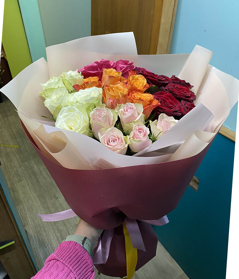 Троянди 4-5 різних кольорів ... А загальну кількість троянд в букеті можете вибрати з нашого списку варіантів.