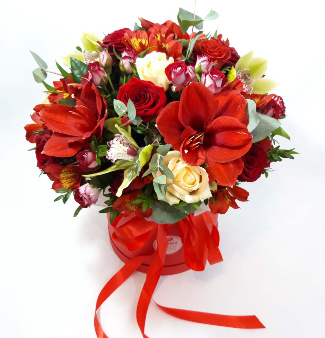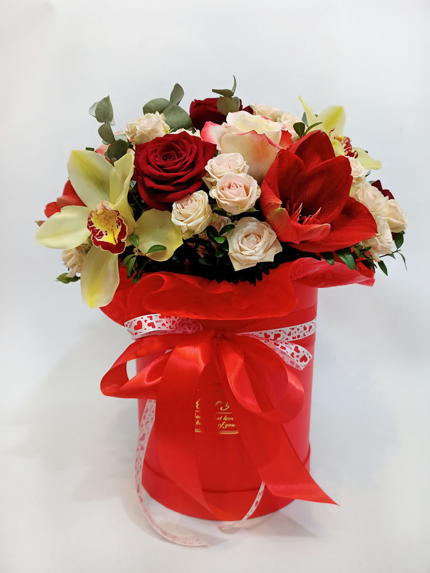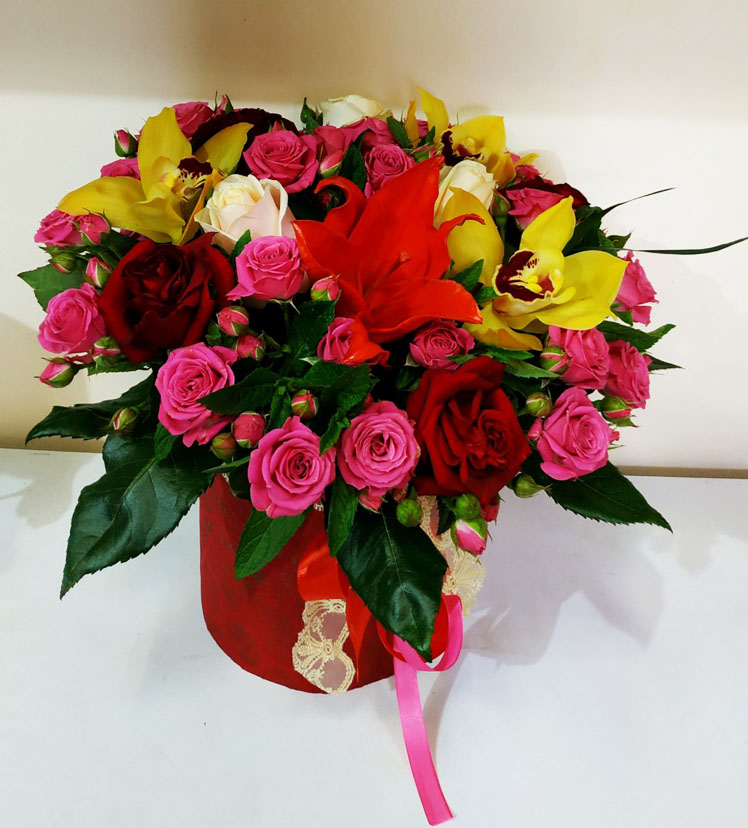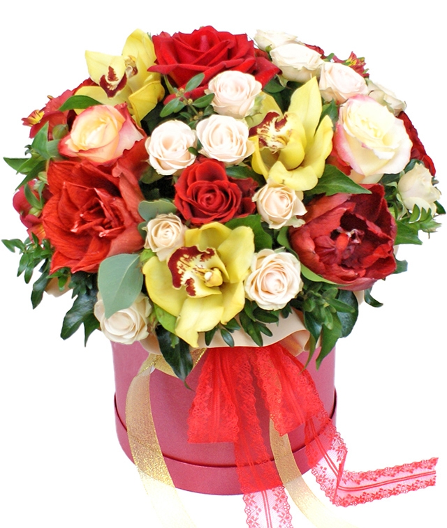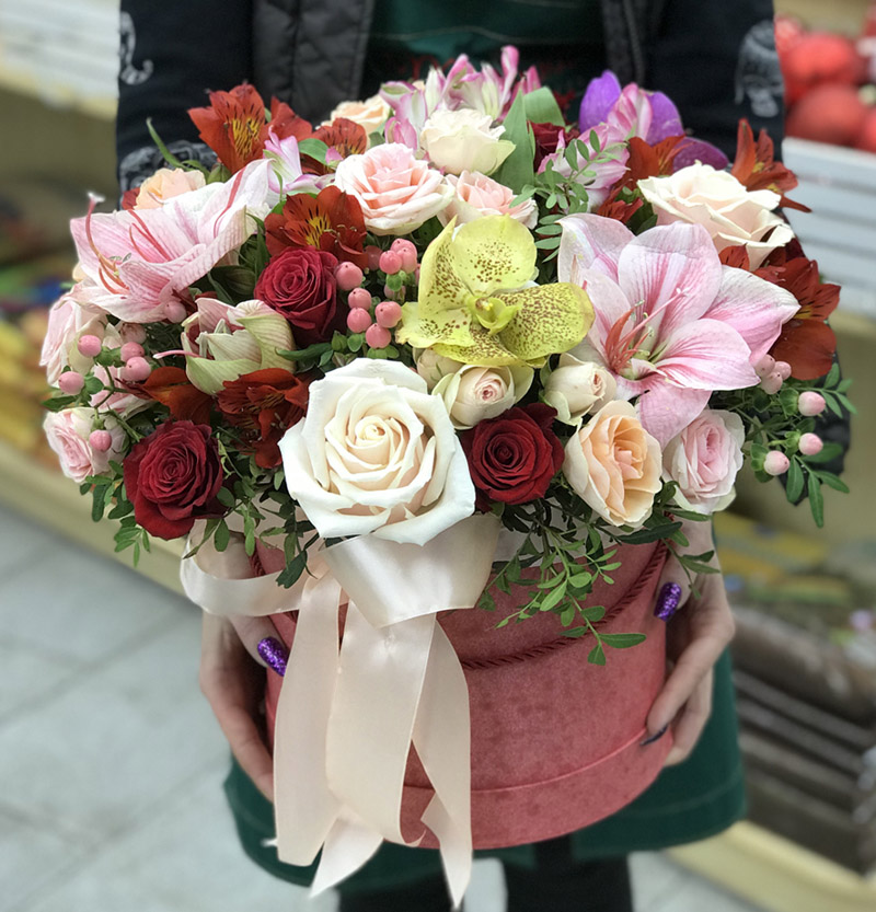 Ексклюзивна розкішна композиція в капелюшнiй коробці з тонко підібраними за кольором трояндами і оттеняющими їх іншими квітами в рожево-червоних тонах.