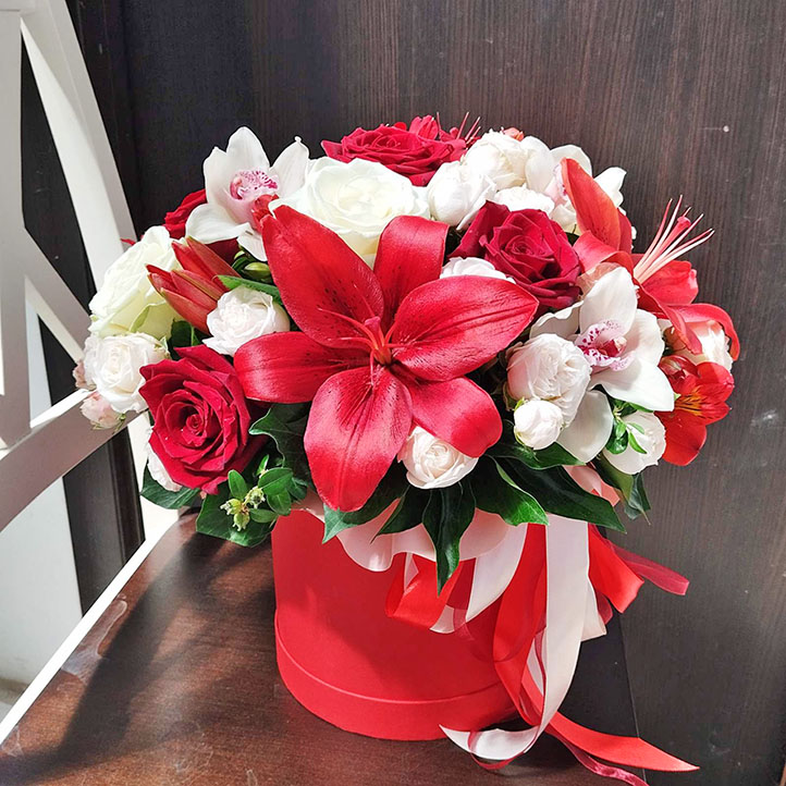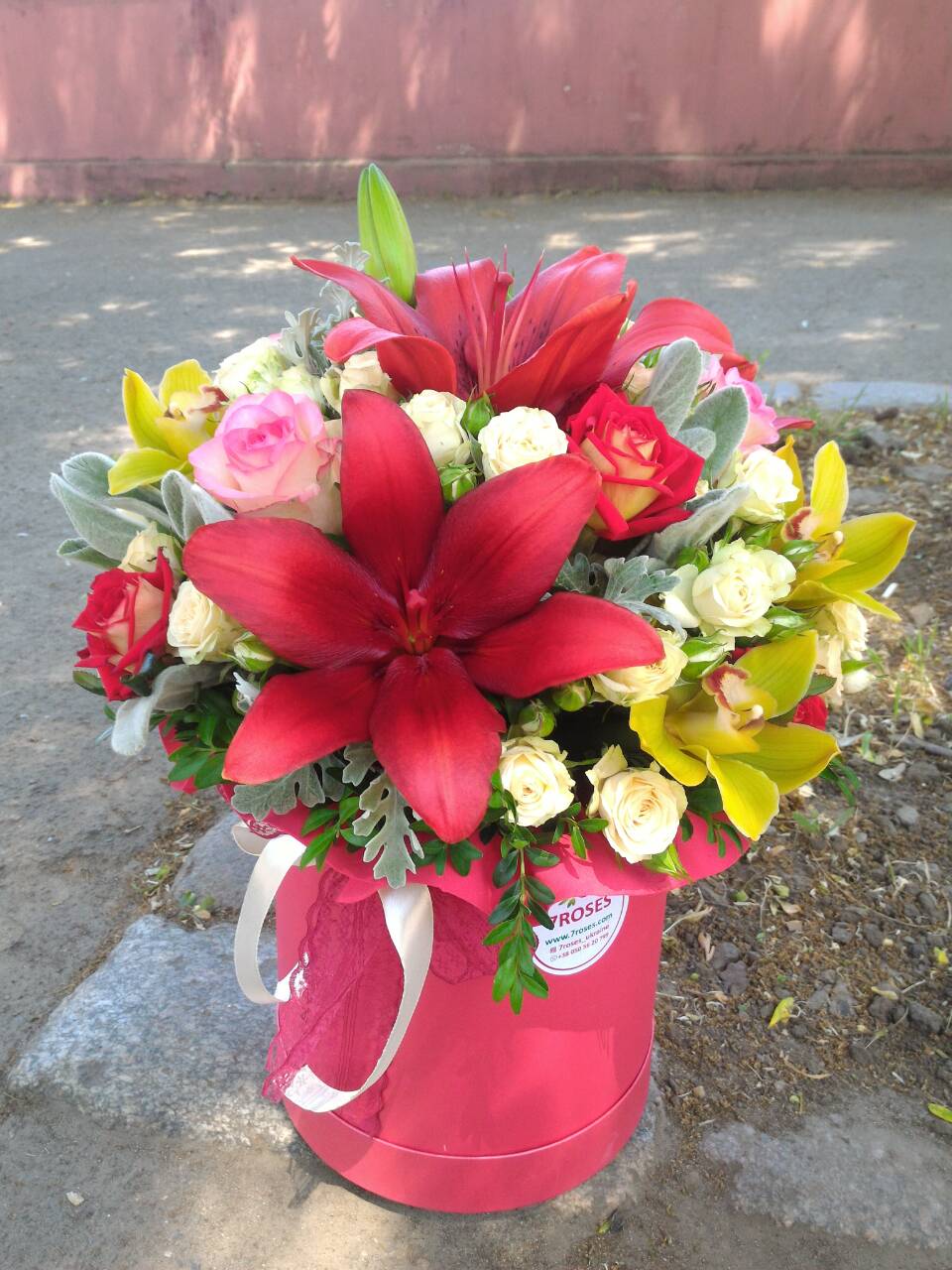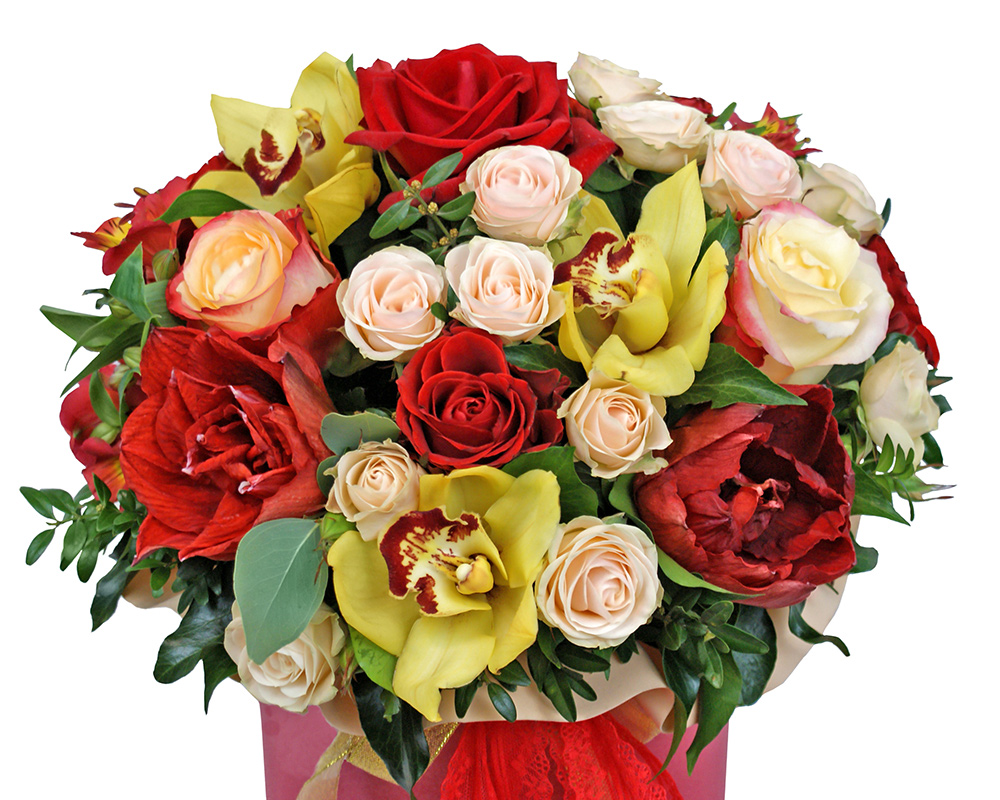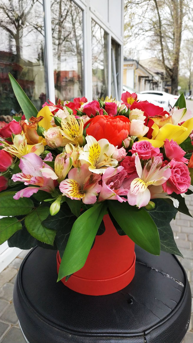 Ексклюзивна розкішна композиція в капелюшнiй коробці з тонко підібраними за кольором трояндами і оттеняющими їх іншими квітами в рожево-червоних тонах.