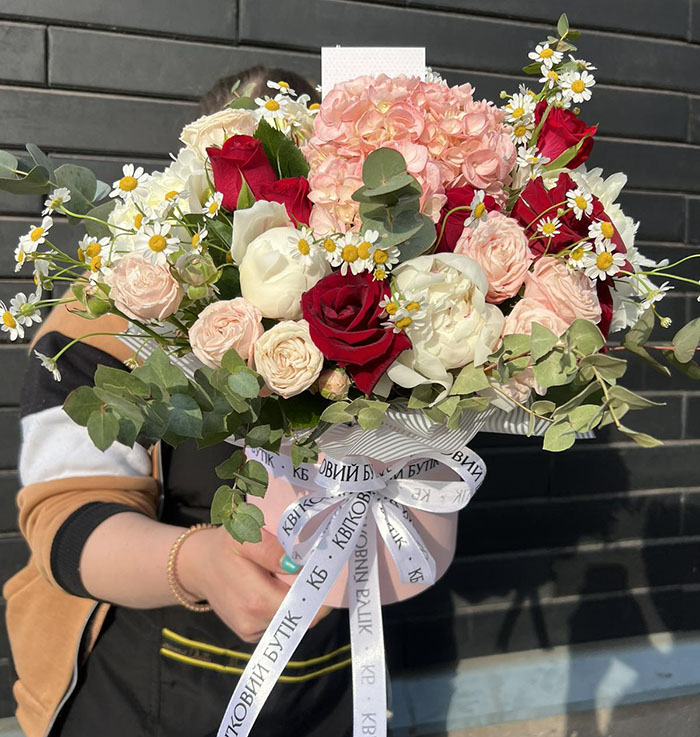 - 5 півоній або гвоздик або кущових троянд по наявності