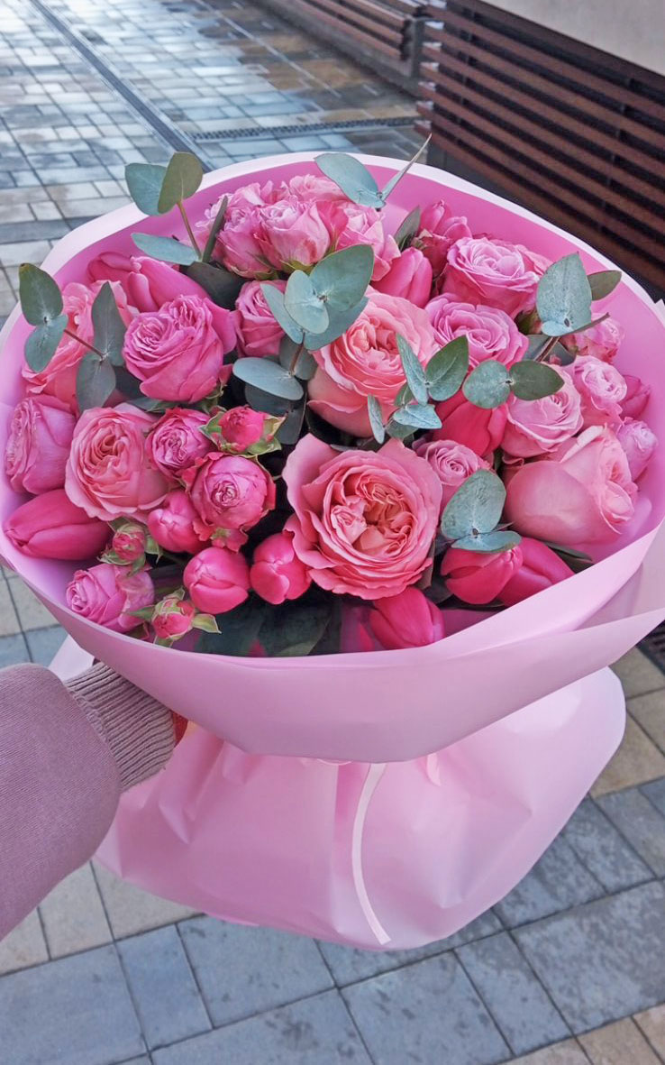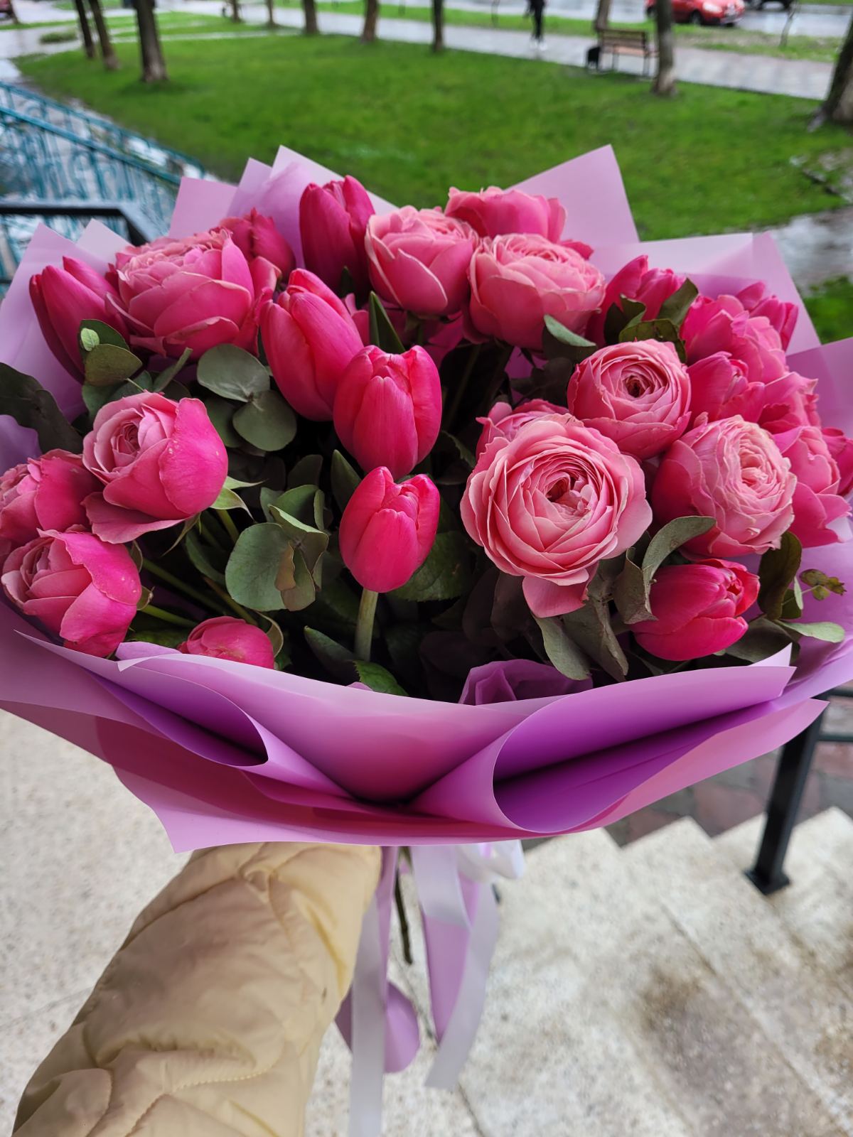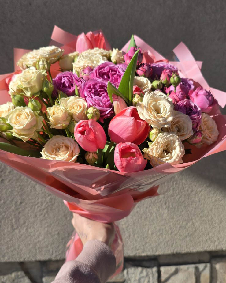 Рожеві Кущові піоноподібні троянди різних за яскравістю тонів і рожеві тюльпани складають цю чарівну композицію.