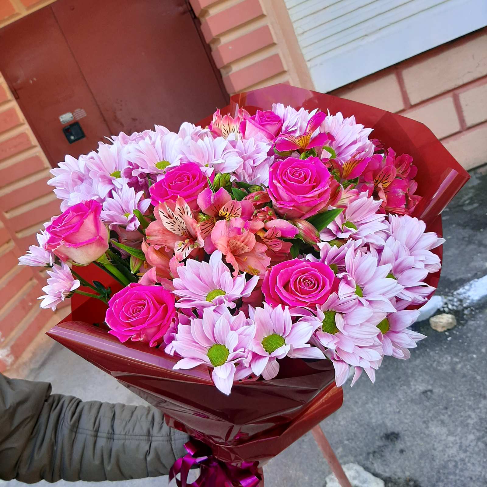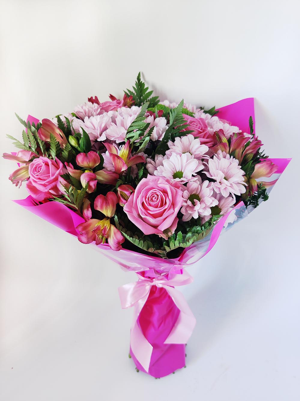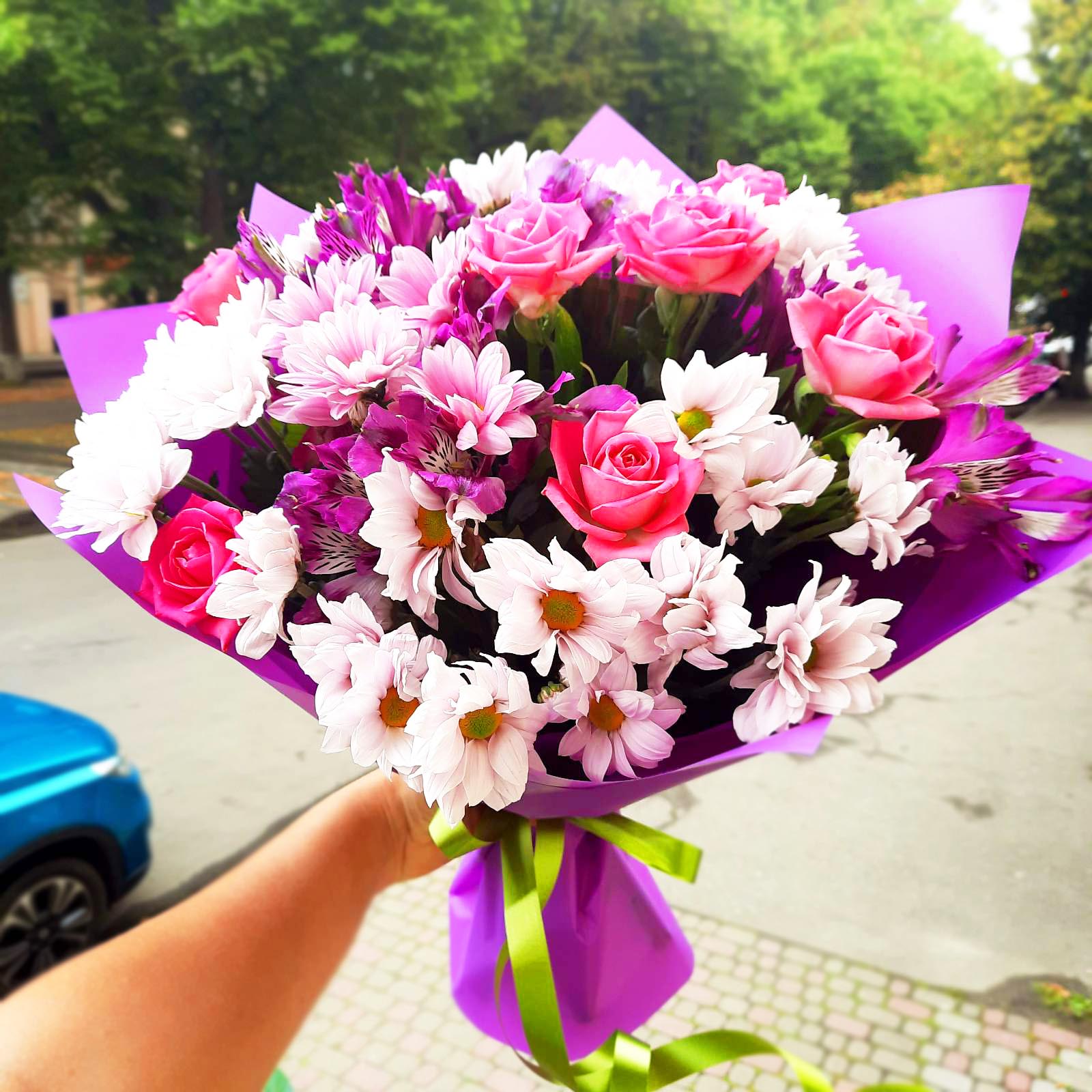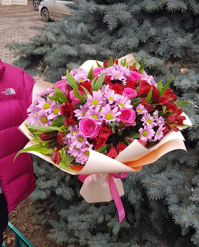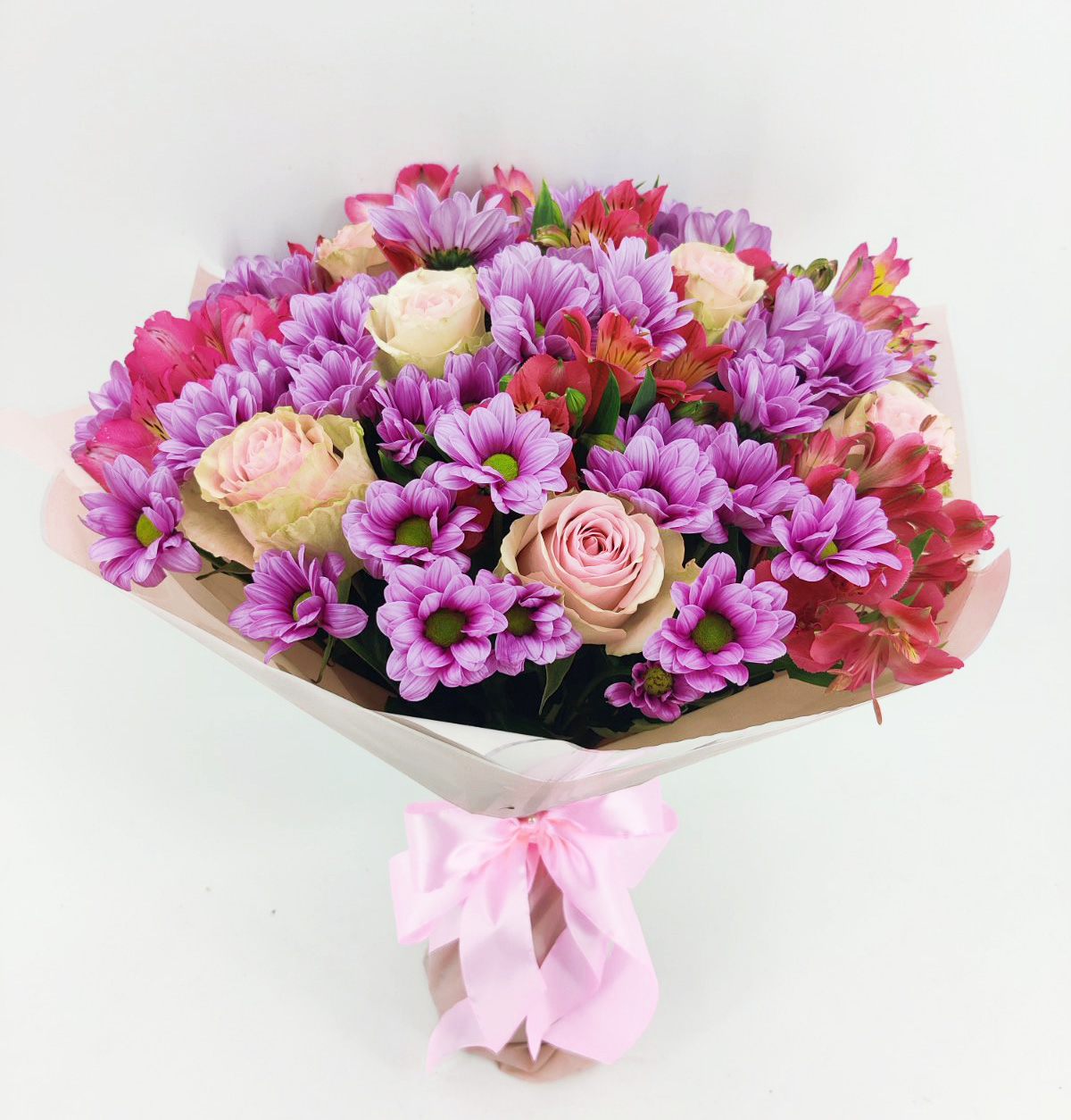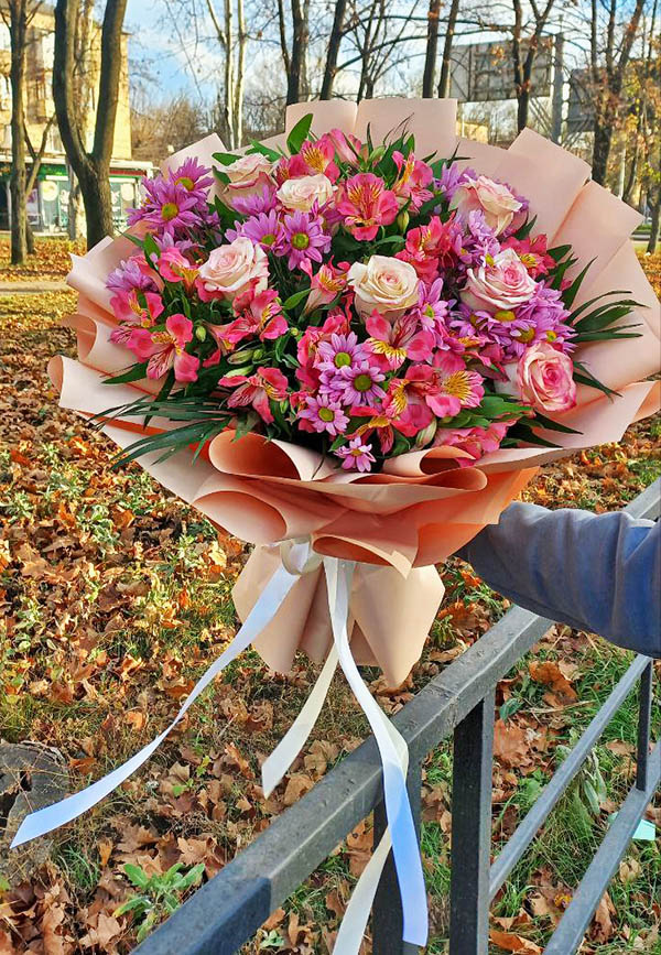 Букет з різних відтінків рожевого: троянди, хризантеми, альстромерії.