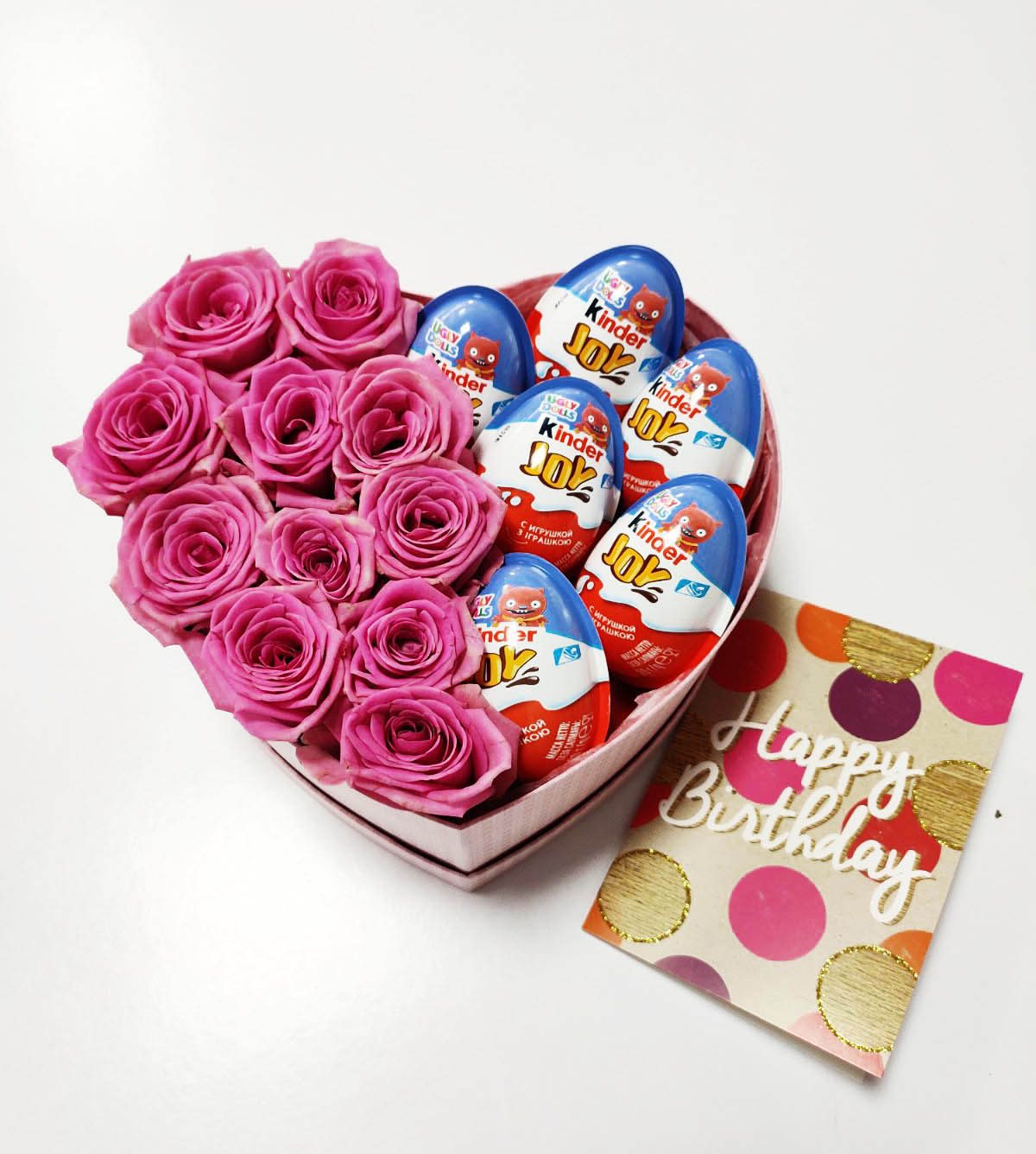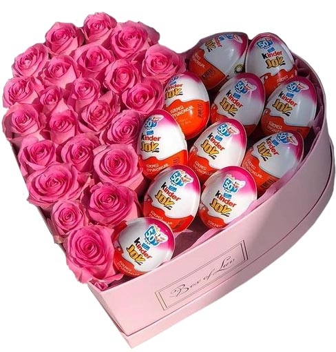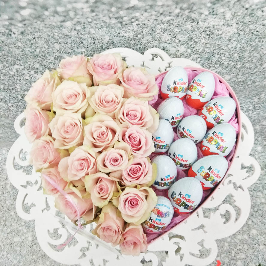 Композиція у формі серця з рожевих троянд і шоколадних яєць.